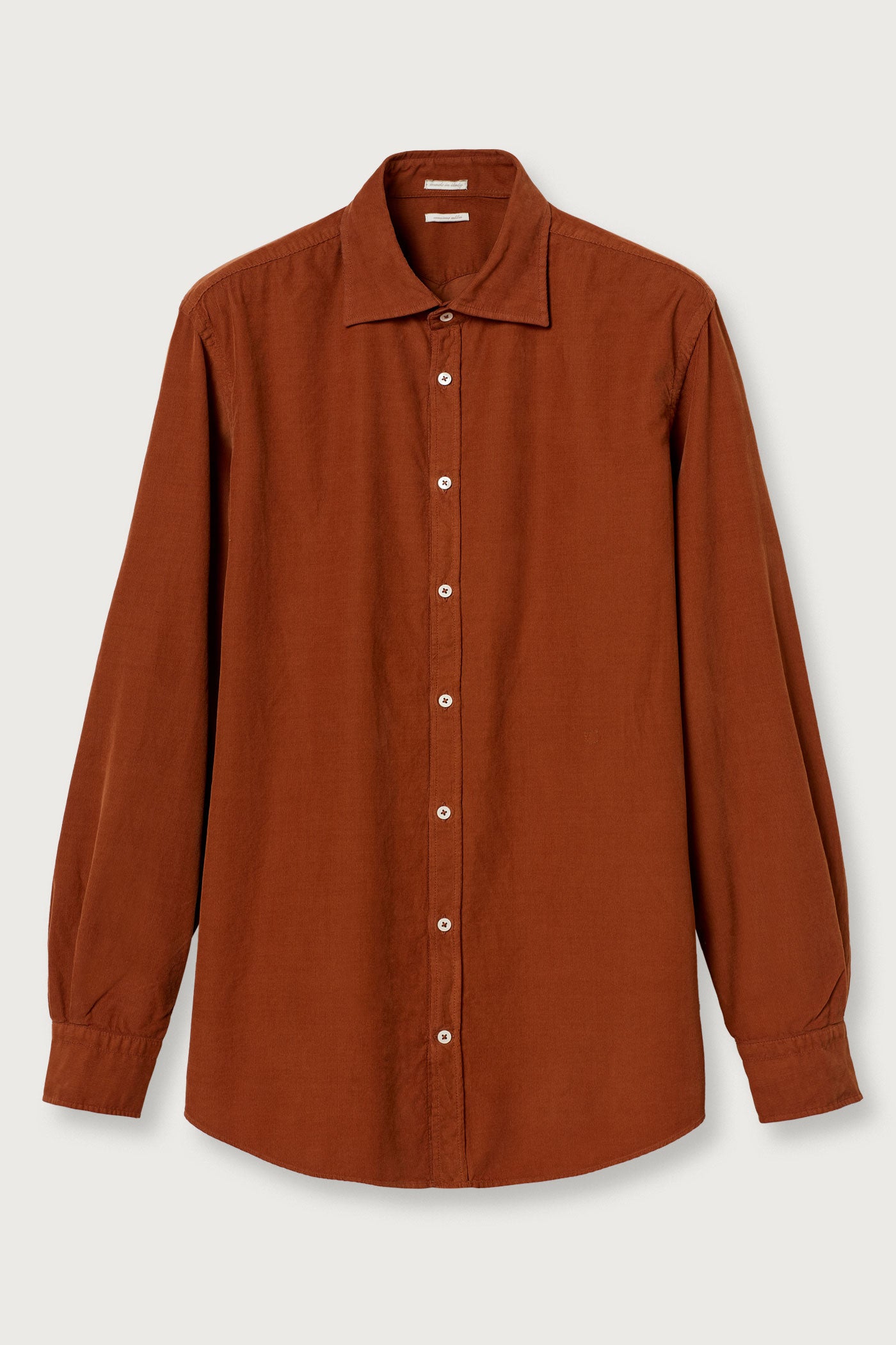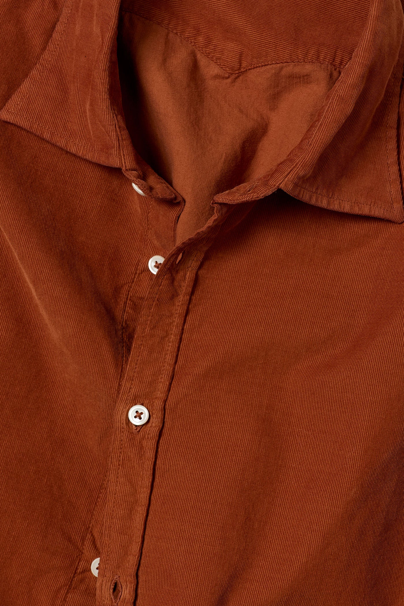 Shirt with pointed collar, front closure, cotton voile plastron detail and embroidered crest for numbering. Pointed back yoke with rounded hem. Regular fit. Crafted from cotton needlecord with a watercolor effect. Made in Italy.