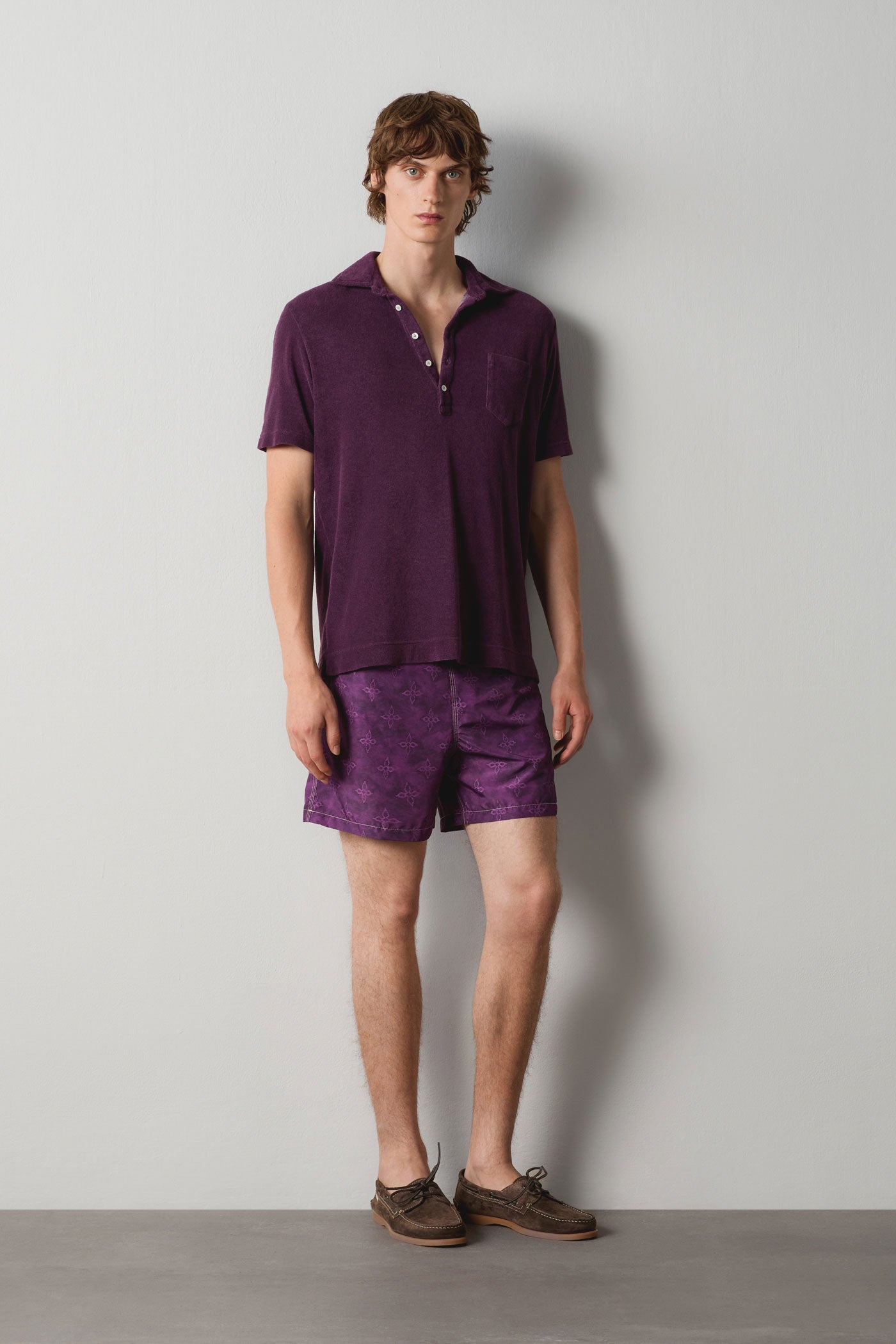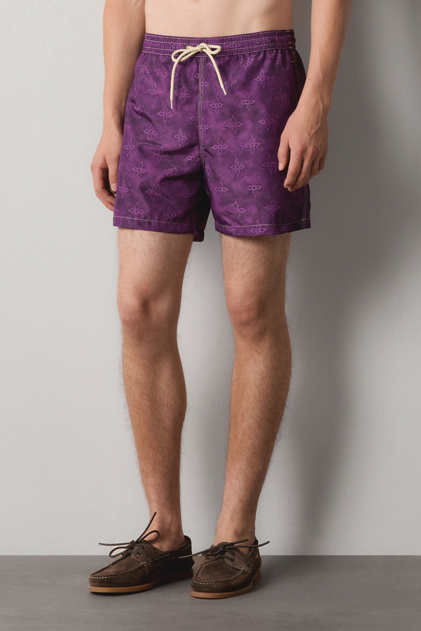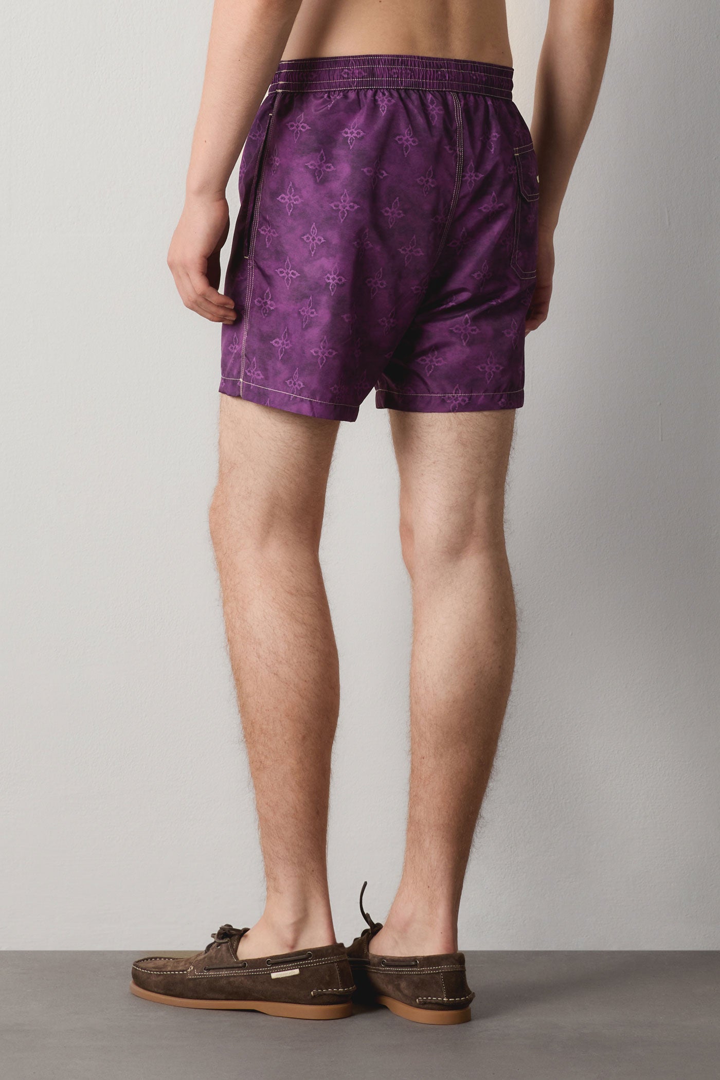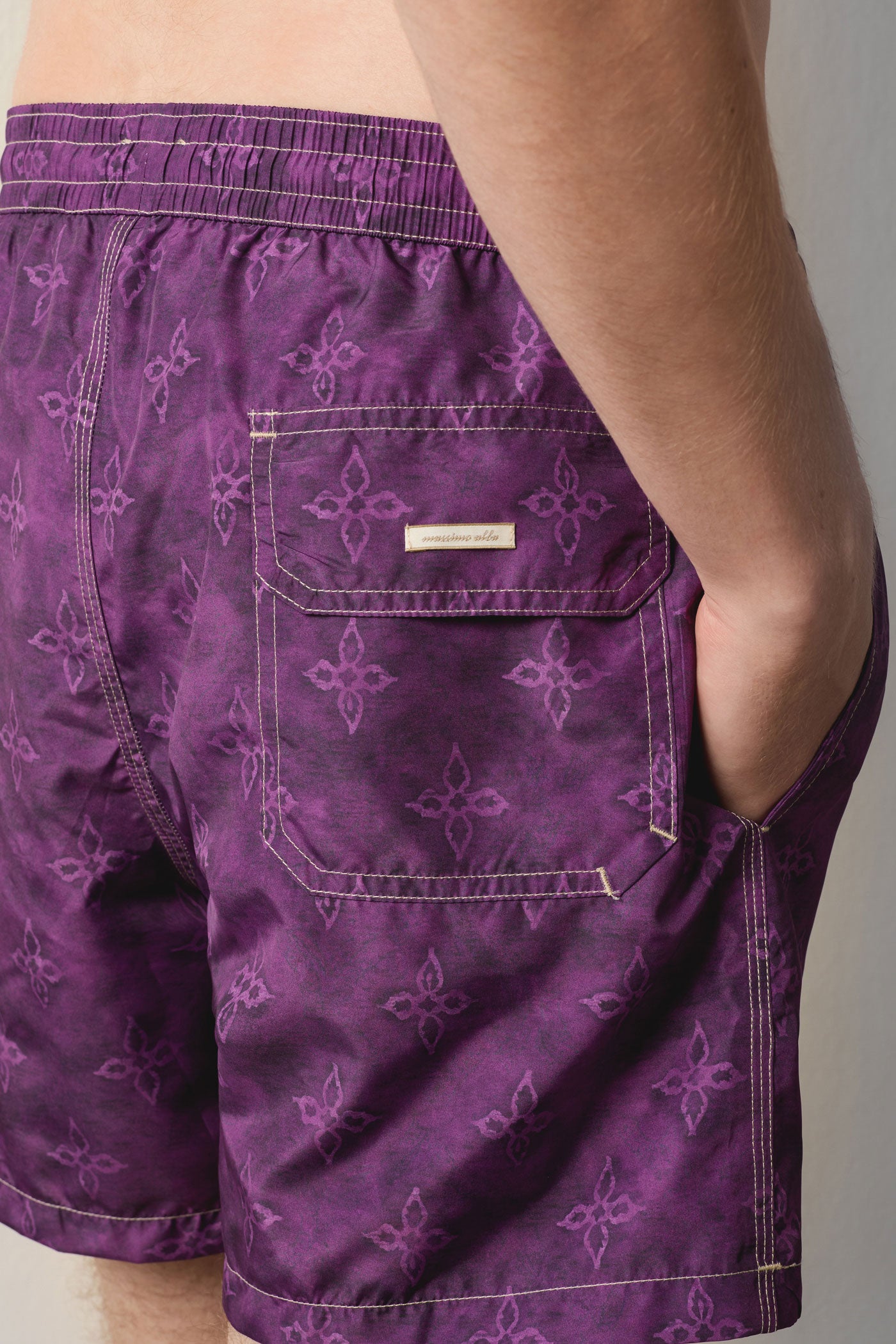 Classic fit swim shorts with a drawstring waistband, two side pockets, a back pocket featuring the Massimo Alba logo, and mesh slip lining. Made in Italy.