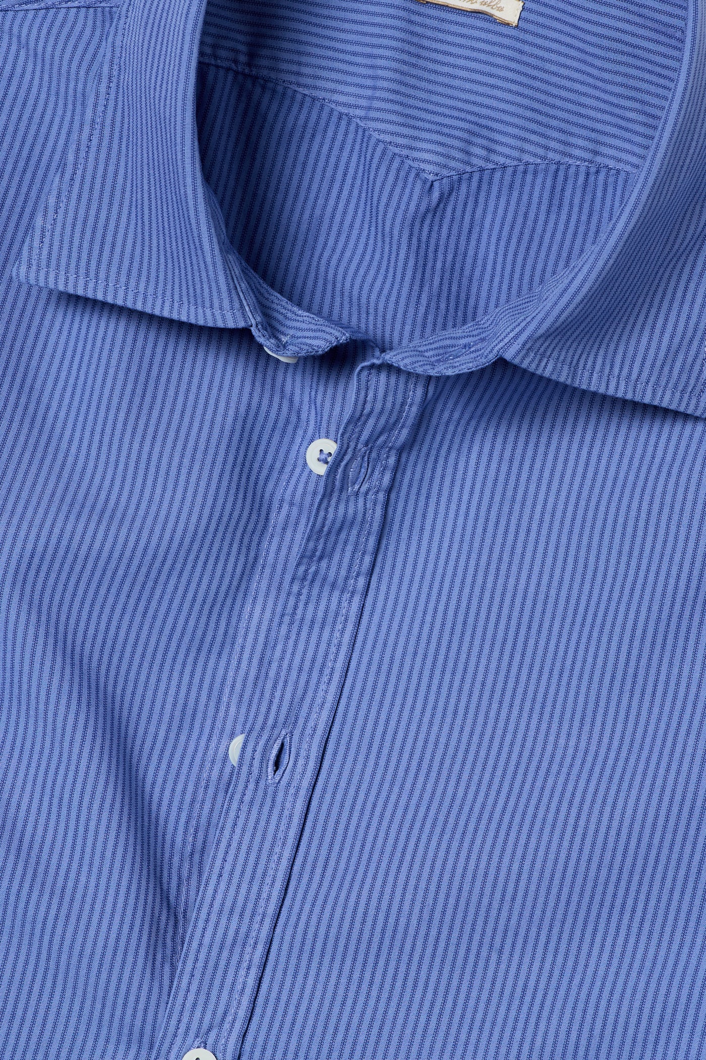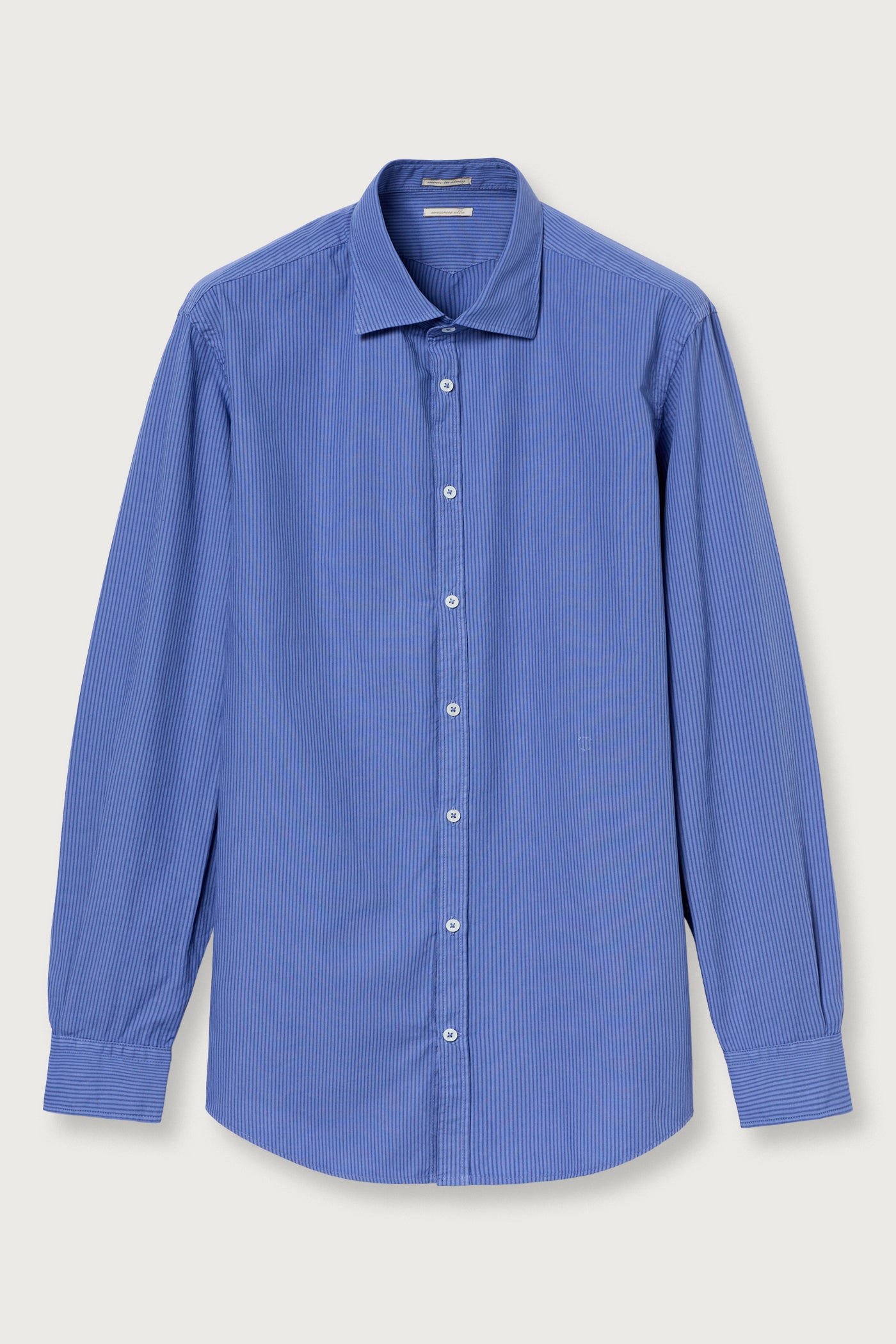 Regular-fit shirt with a pointed collar, classic soft front placket, and a cotton voilè inner bib. Made of striped jacquard cotton. Features custom badge embroidery for initials and a pointed rear yoke. Made in Italy.