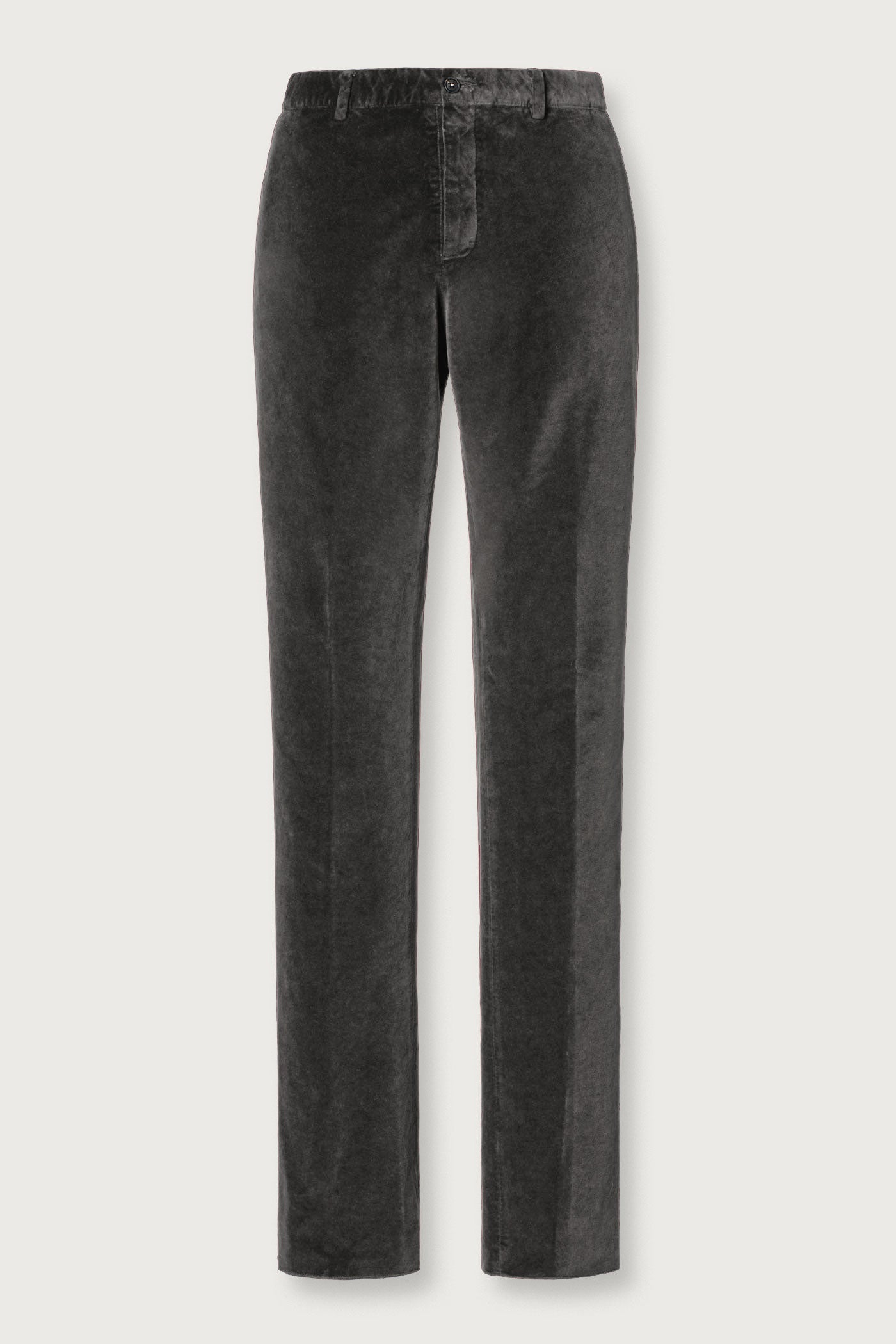 Slim-fit trousers with a flat front, welt pockets, front tab closure with concealed zip and dark horn button, and belt loops at the waist. Crafted from cotton velvet. Made in Italy.