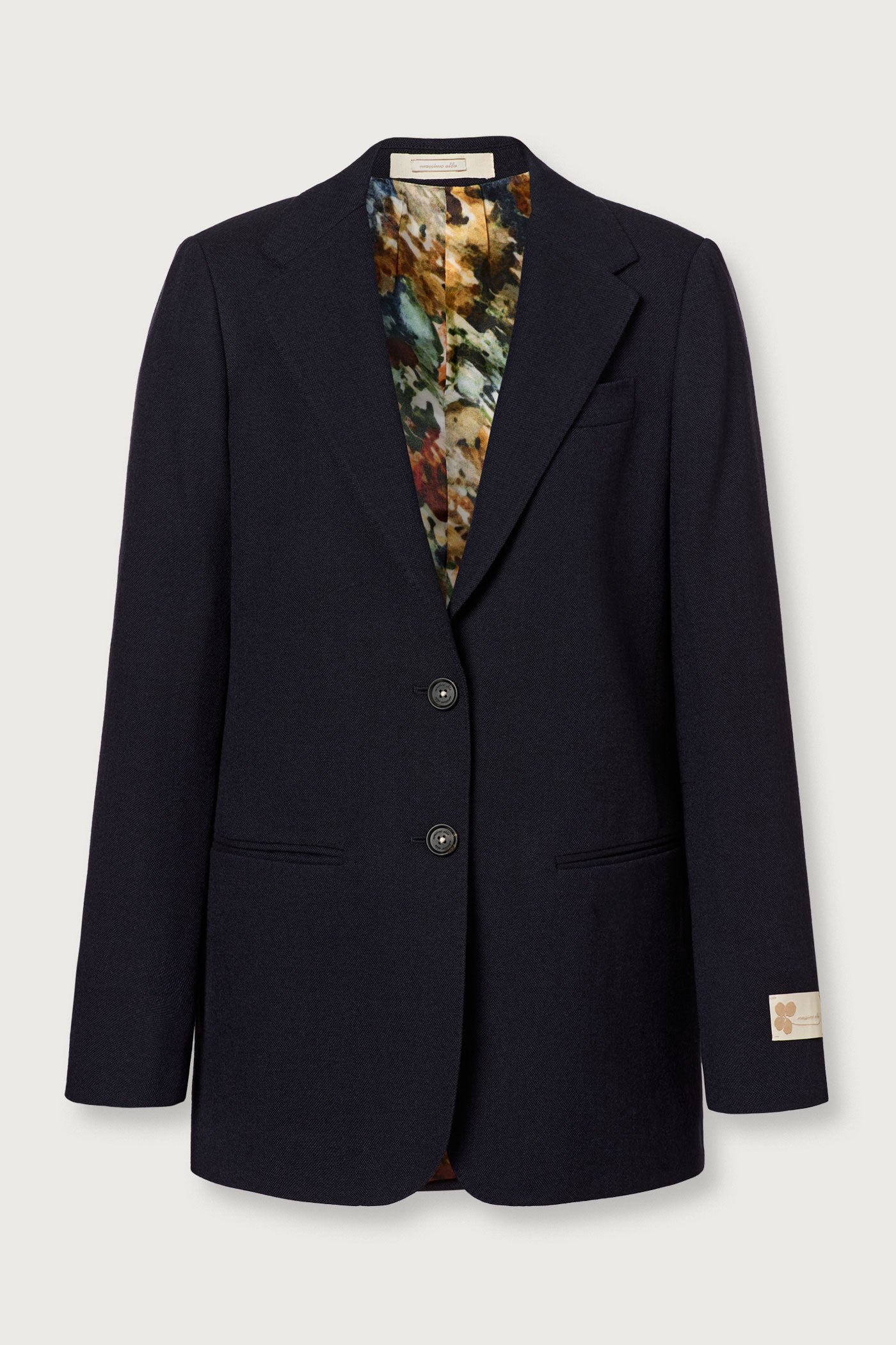 Single-breasted jacket with structured shoulders and exclusive patterned lining, featuring welt pockets, peak lapels and two genuine horn buttons. Crafted from wool. Made in Italy.