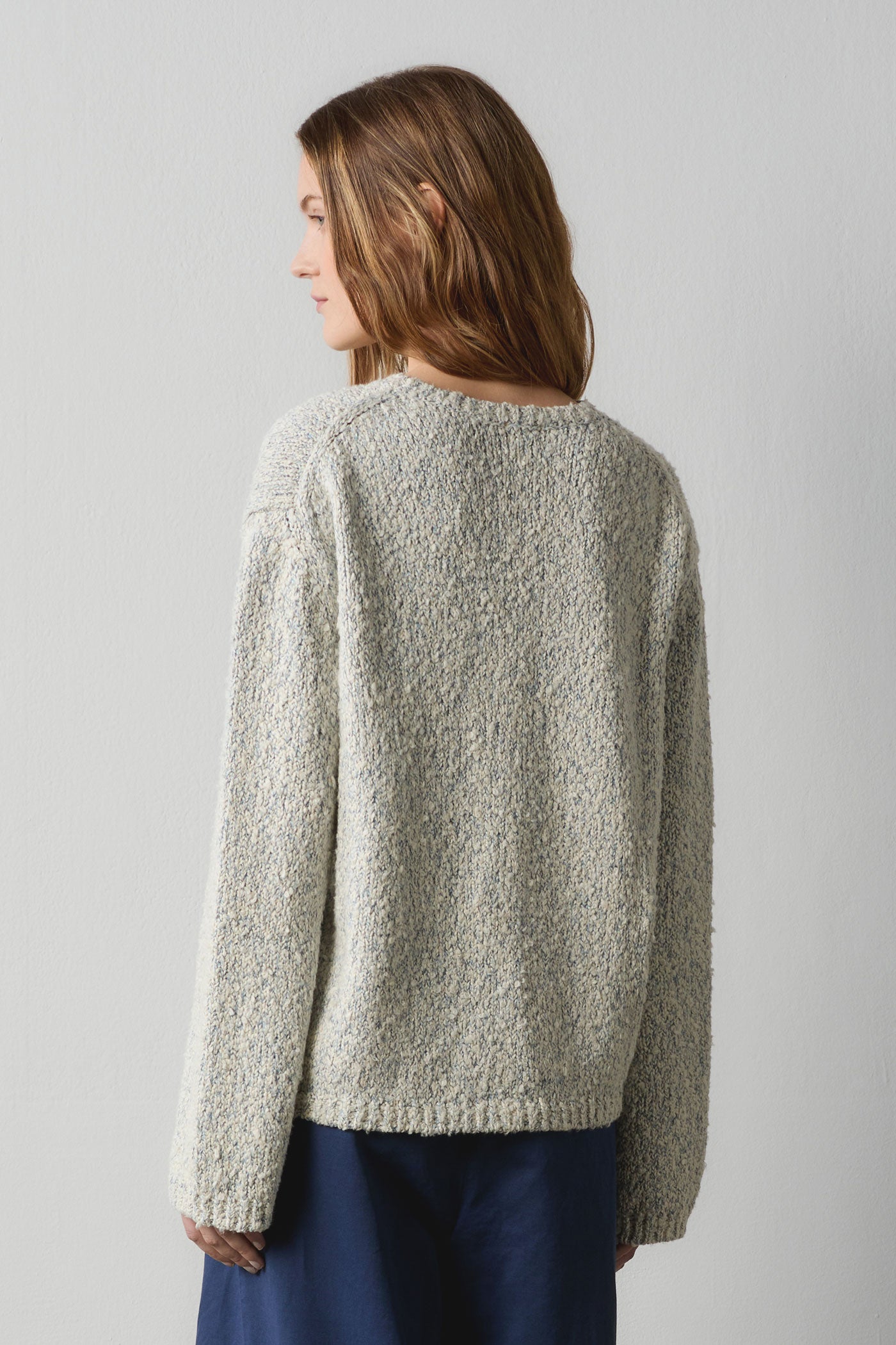 Comfort-fit wide crewneck sweater with dropped shoulders and ribbed edges. Crafted from an exclusive bouclé yarn, knitted in gauge 3 stocking stitch. Made in Italy.