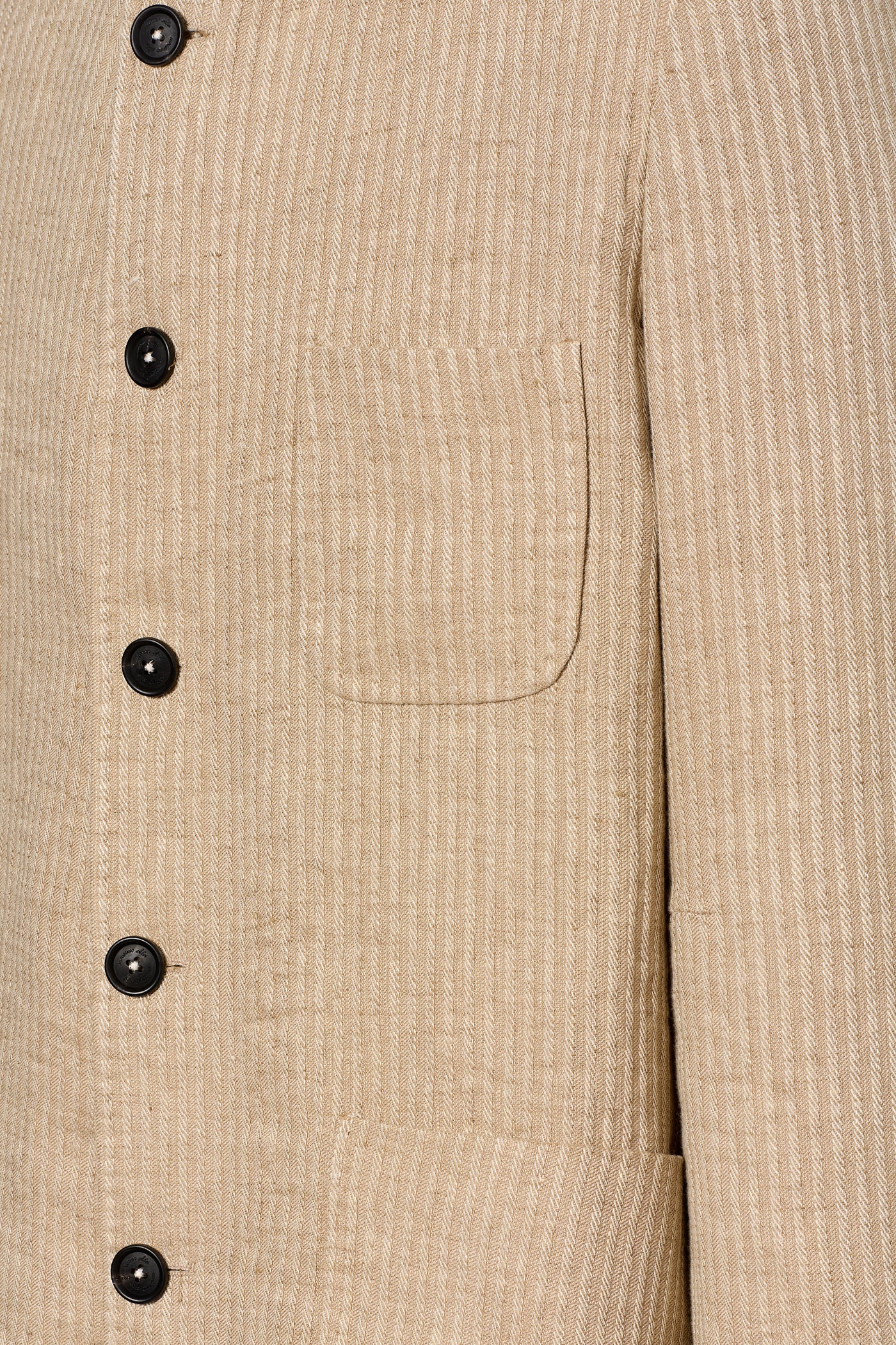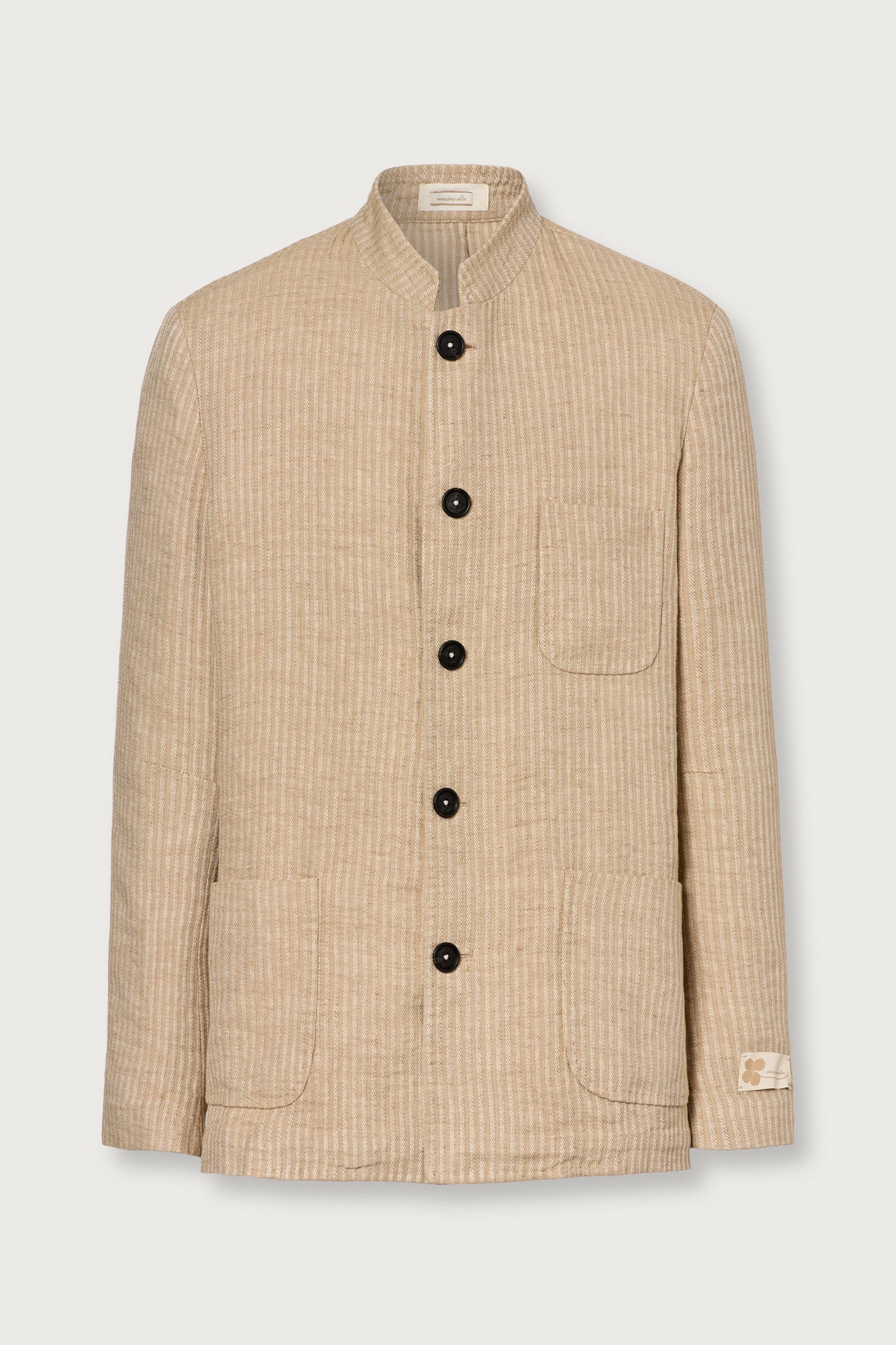 Single-breasted jacket with band collar, unstructured and unlined, featuring patch pockets and six dark horn buttons. Crafted from striped jacquard linen–cotton. Made in Italy.