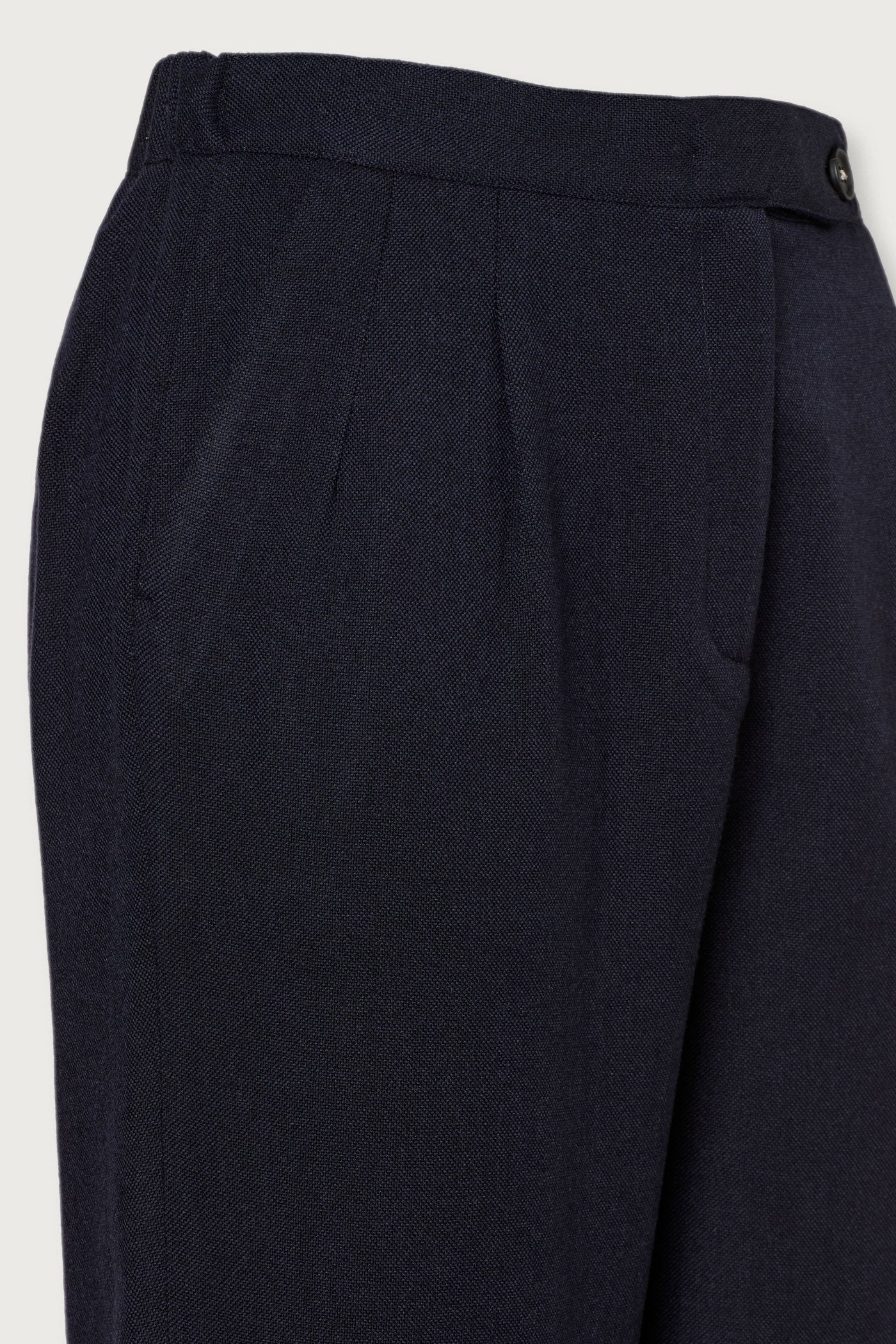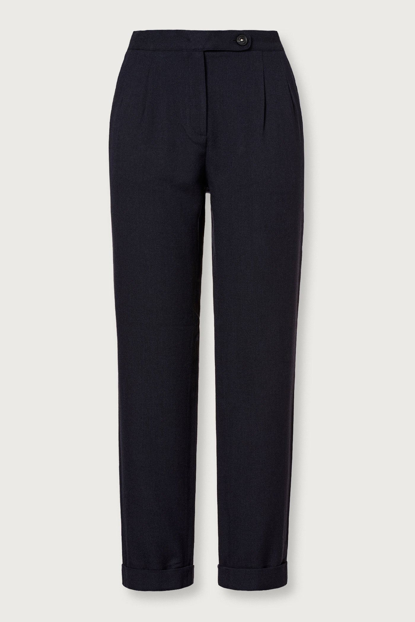 Mid-rise comfort-fit trousers with double pleats, carrot leg tapered at the ankle and cuffed hem. Zip closure with horn button on side waistband. Crafted from soft wool. Made in Italy.