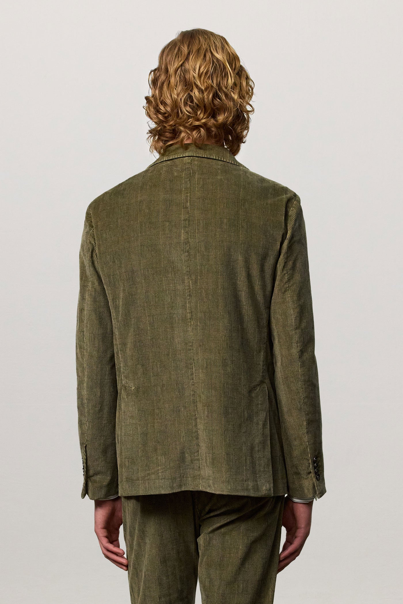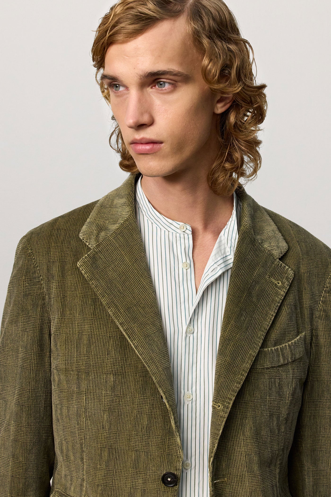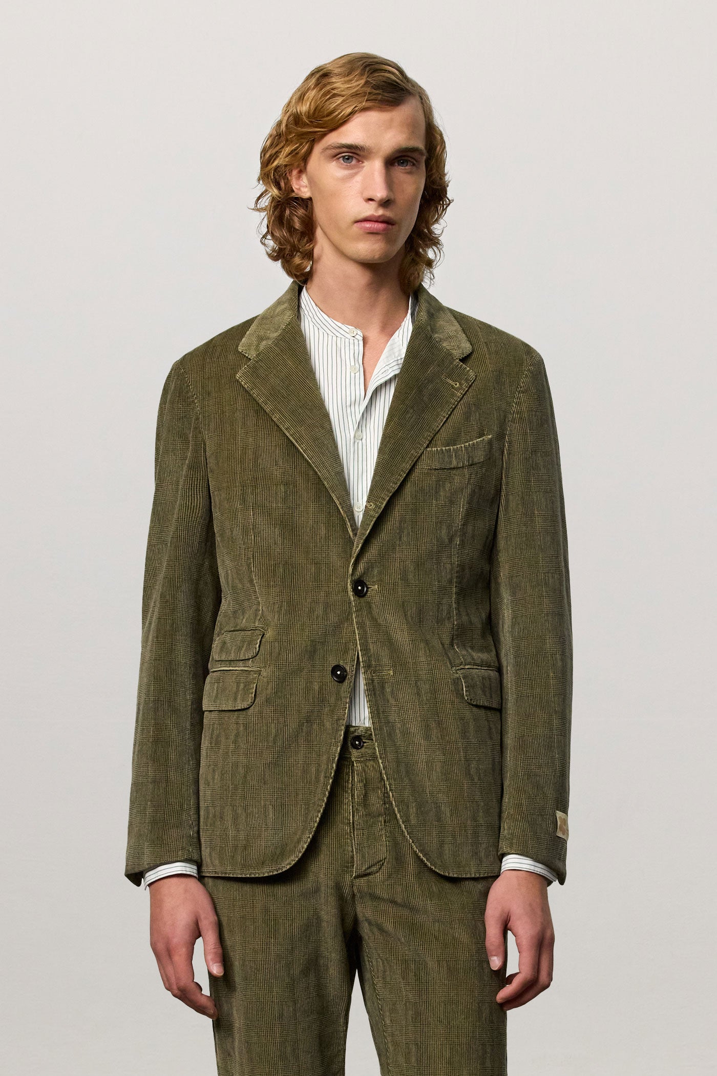 Regular-fit jacket inspired by classic tailoring. Single-breasted with notch lapels, flap pockets with a ticket pocket, and double back vents. Finished with horn buttons. Made from comfort Prince of Wales velvet. Made in Italy.