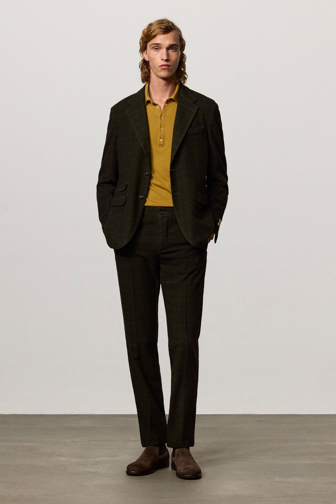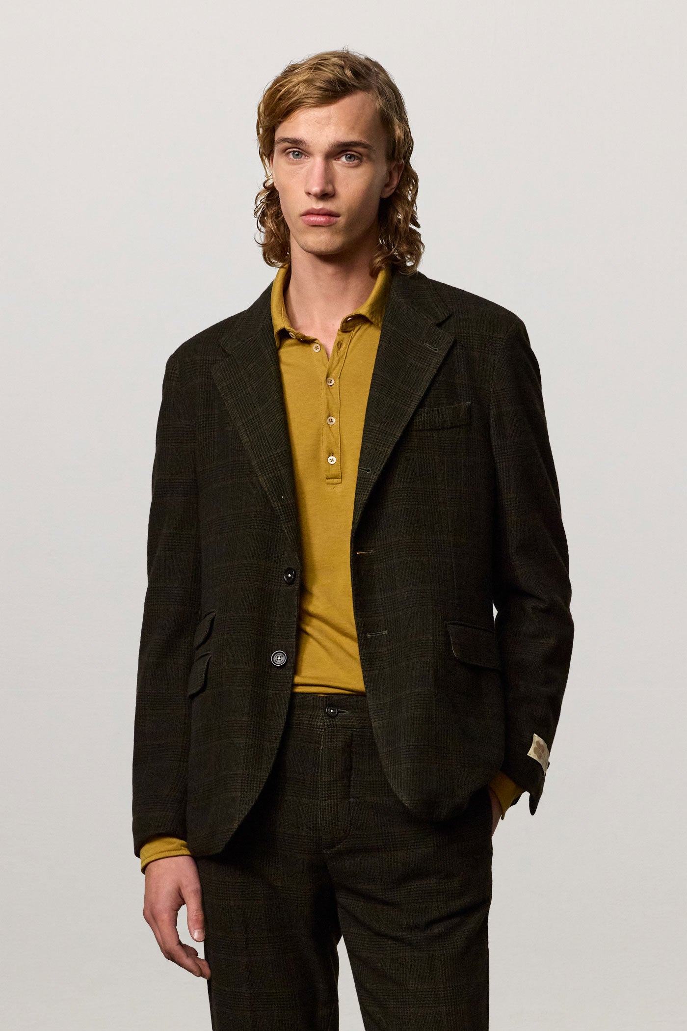 Regular-fit jacket inspired by classic tailoring. Single-breasted with notch lapels, flap pockets with a ticket pocket, and double back vents. Finished with horn buttons. Made from Prince of Wales pattern in pure virgin wool. Made in Italy.