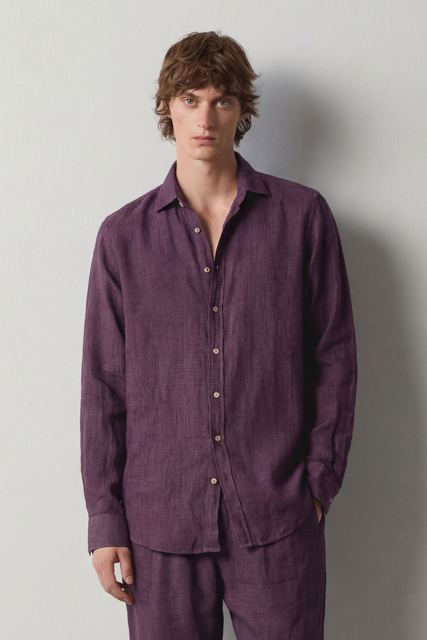 Regular-fit shirt with a pointed collar, classic soft front placket, and a cotton voilè inner bib. Made of pied de poule watercolor linen. Features custom badge embroidery for initials and a pointed rear yoke. Made in Italy.