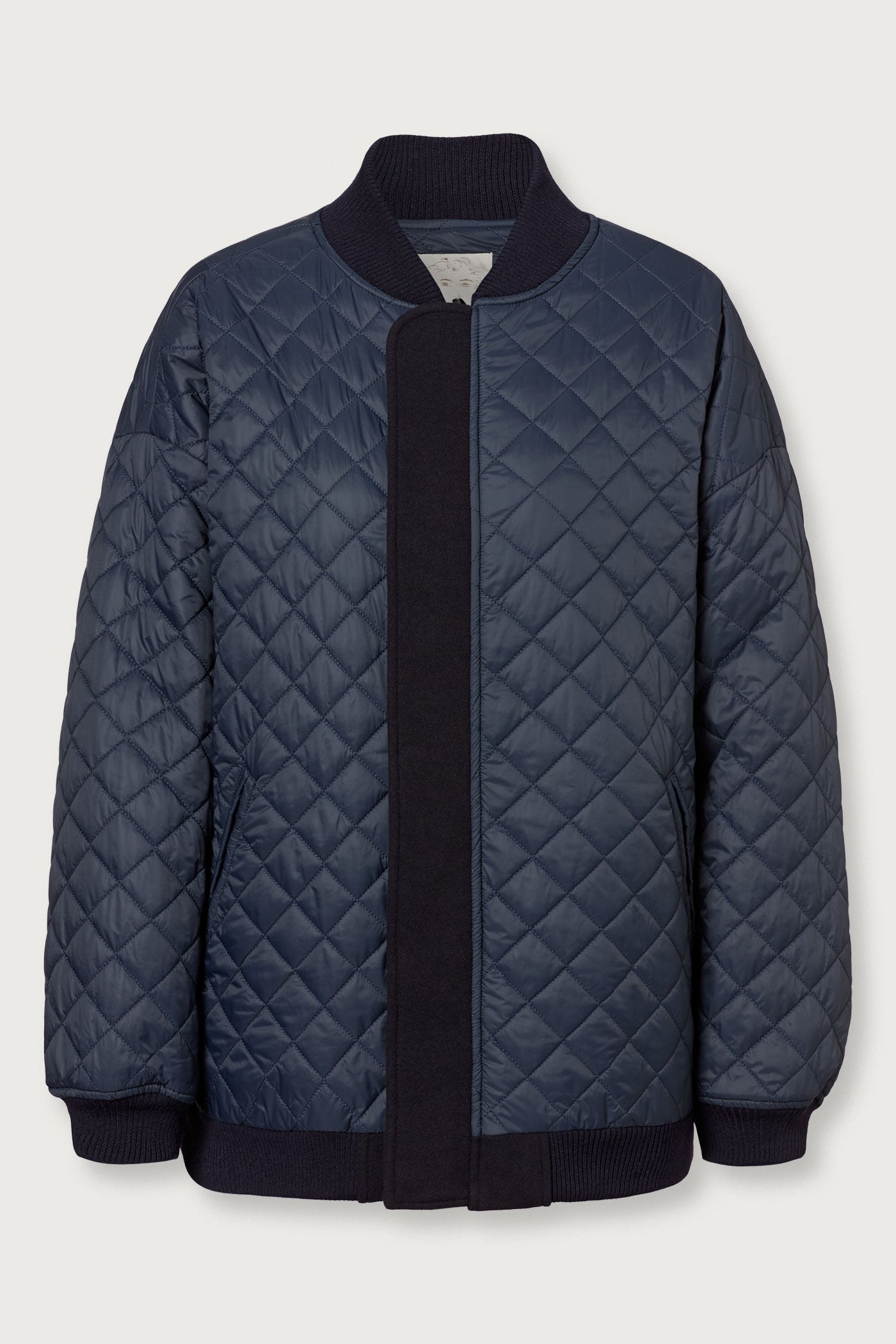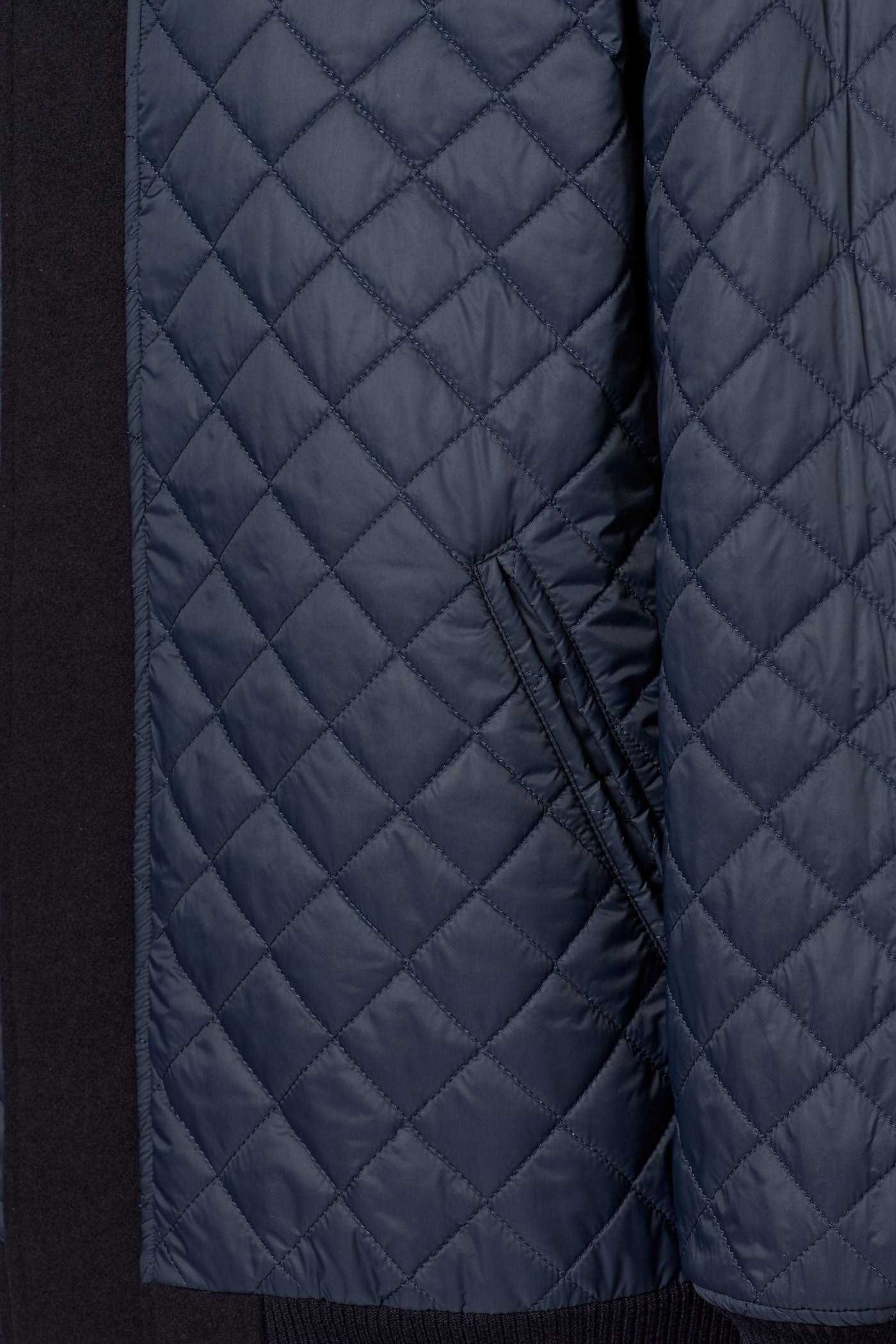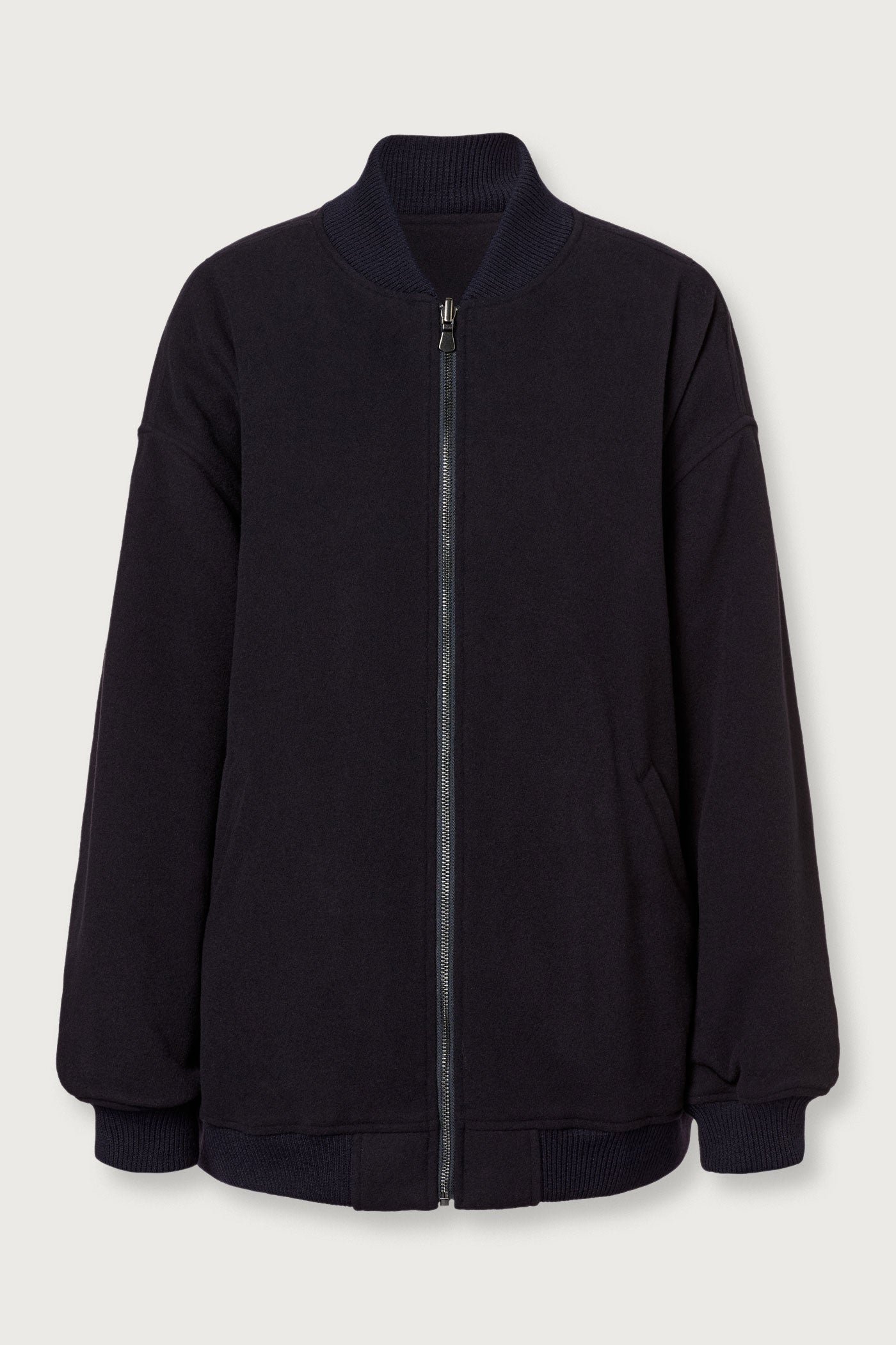 Reversible padded bomber jacket with a relaxed fit, featuring a front zip closure and raglan sleeves. It has two welt pockets on both sides. One side is crafted in compact virgin wool fabric, while the other side is quilted for extra warmth and style versatility. The jacket is finished with ribbed edges for a comfortable and snug fit. Made in Italy.