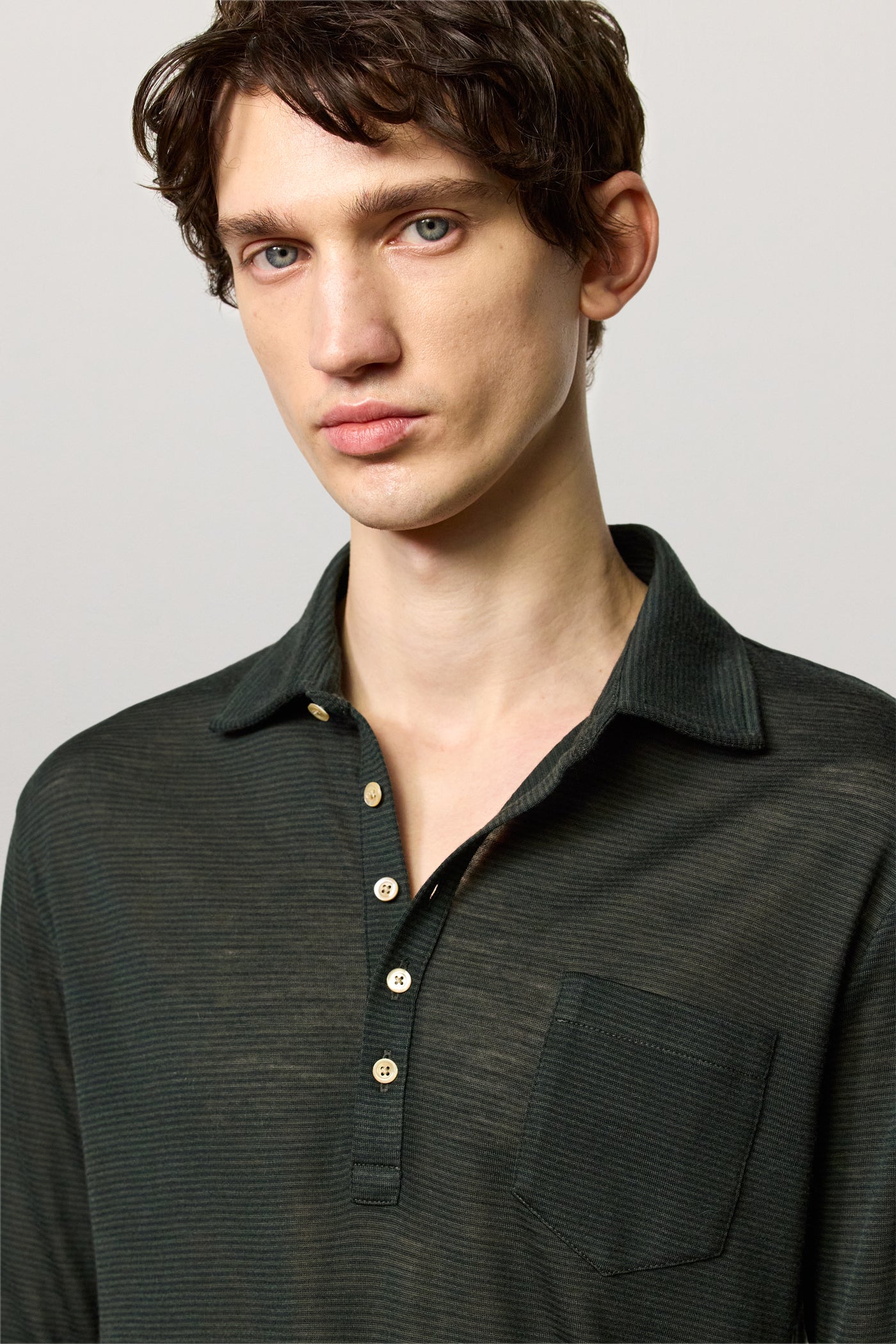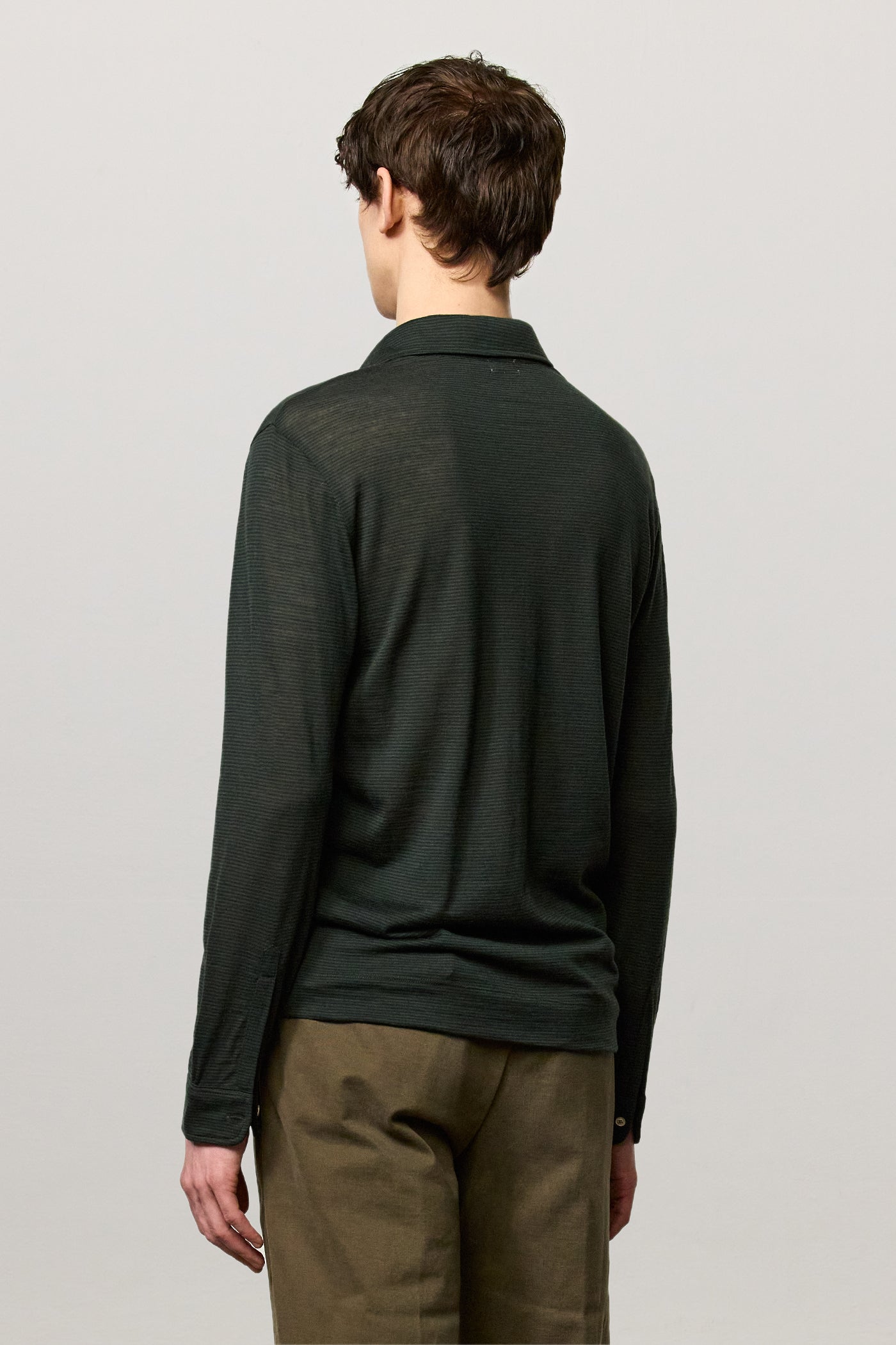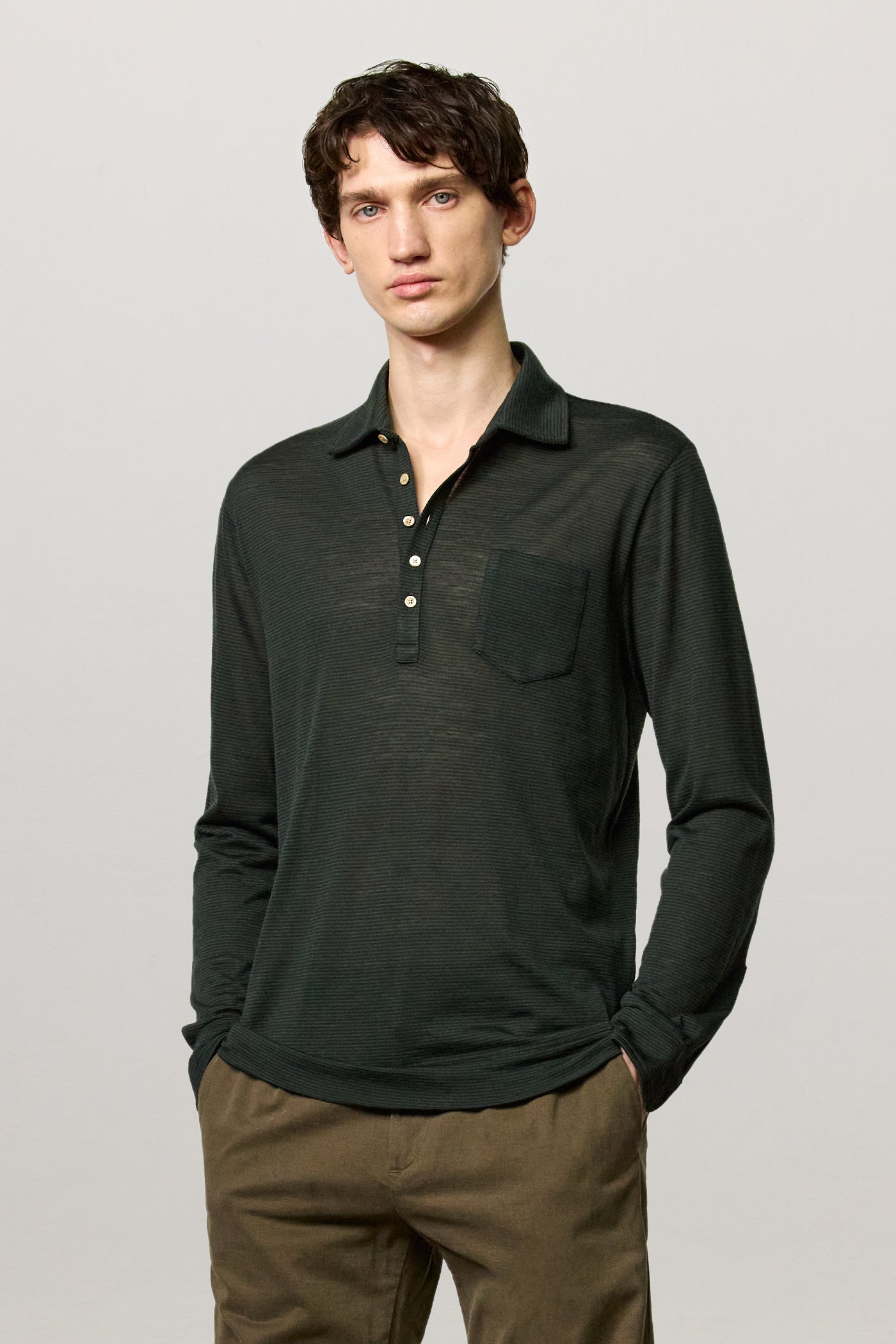 Long-sleeved polo shirt with shirt-style cuffs, deep opening with five mother-of-pearl buttons and a regular fit. Crafted from wool. Made in Italy.