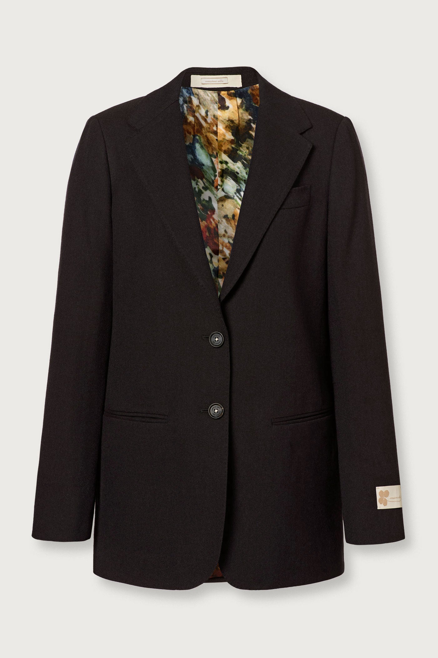 Single-breasted jacket with structured shoulders and exclusive patterned lining, featuring welt pockets, peak lapels and two genuine horn buttons. Crafted from melange virgin wool flannel. Made in Italy.