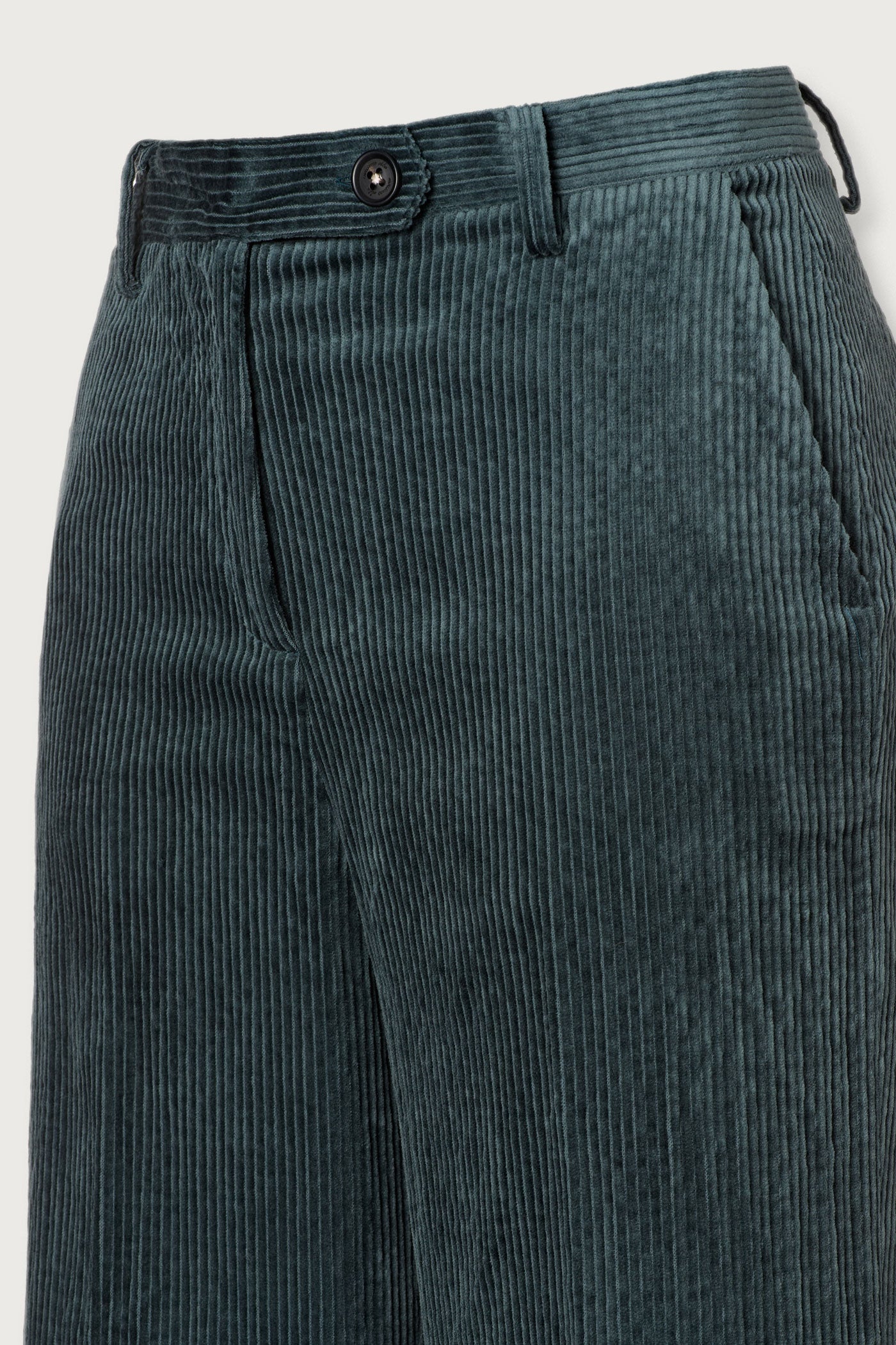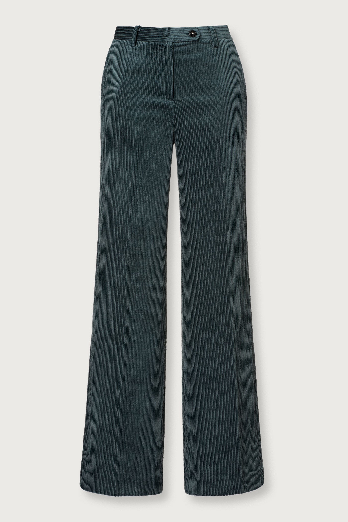 High-rise palazzo trousers with welt pockets, zip closure and side-buttoned waistband. Crafted from cotton corduroy with a shiny modal finish. Made in Italy.