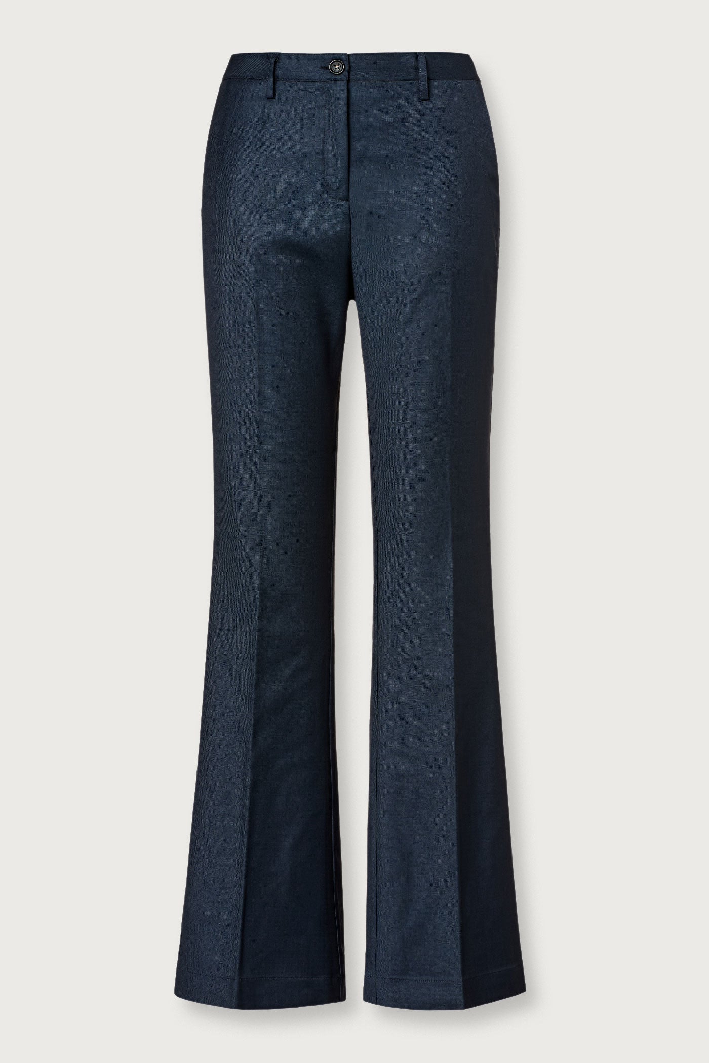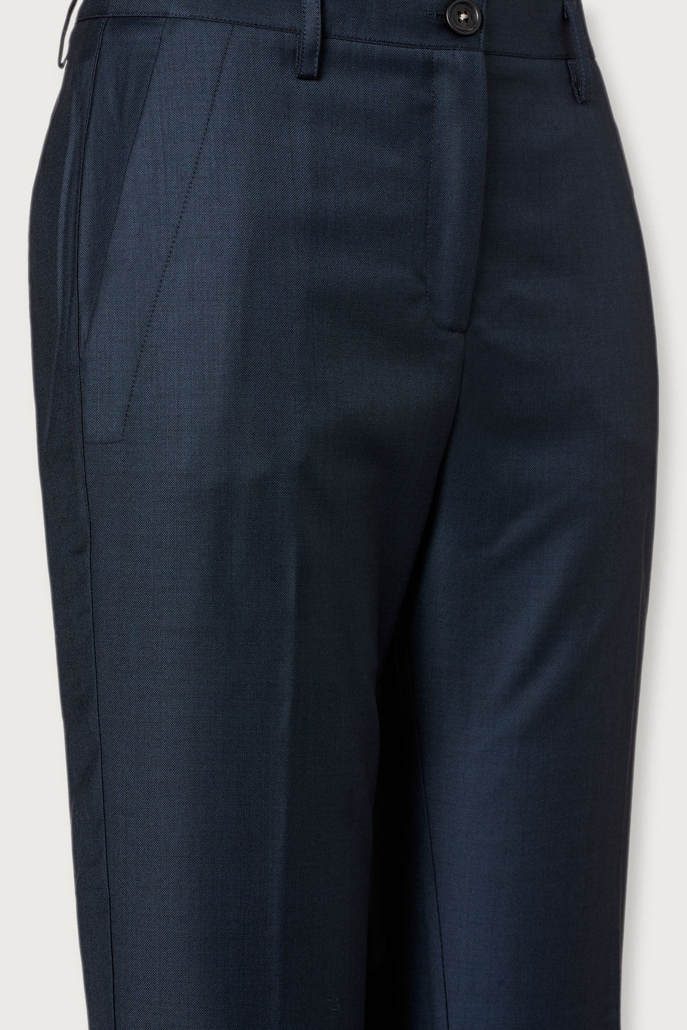 Medium rise pants, classic fit, flat front, slim leg that slightly flares at the bottom, slanted pockets, zip and button closure, made of two-tone iridescent twill in virgin wool. Made in Italy.