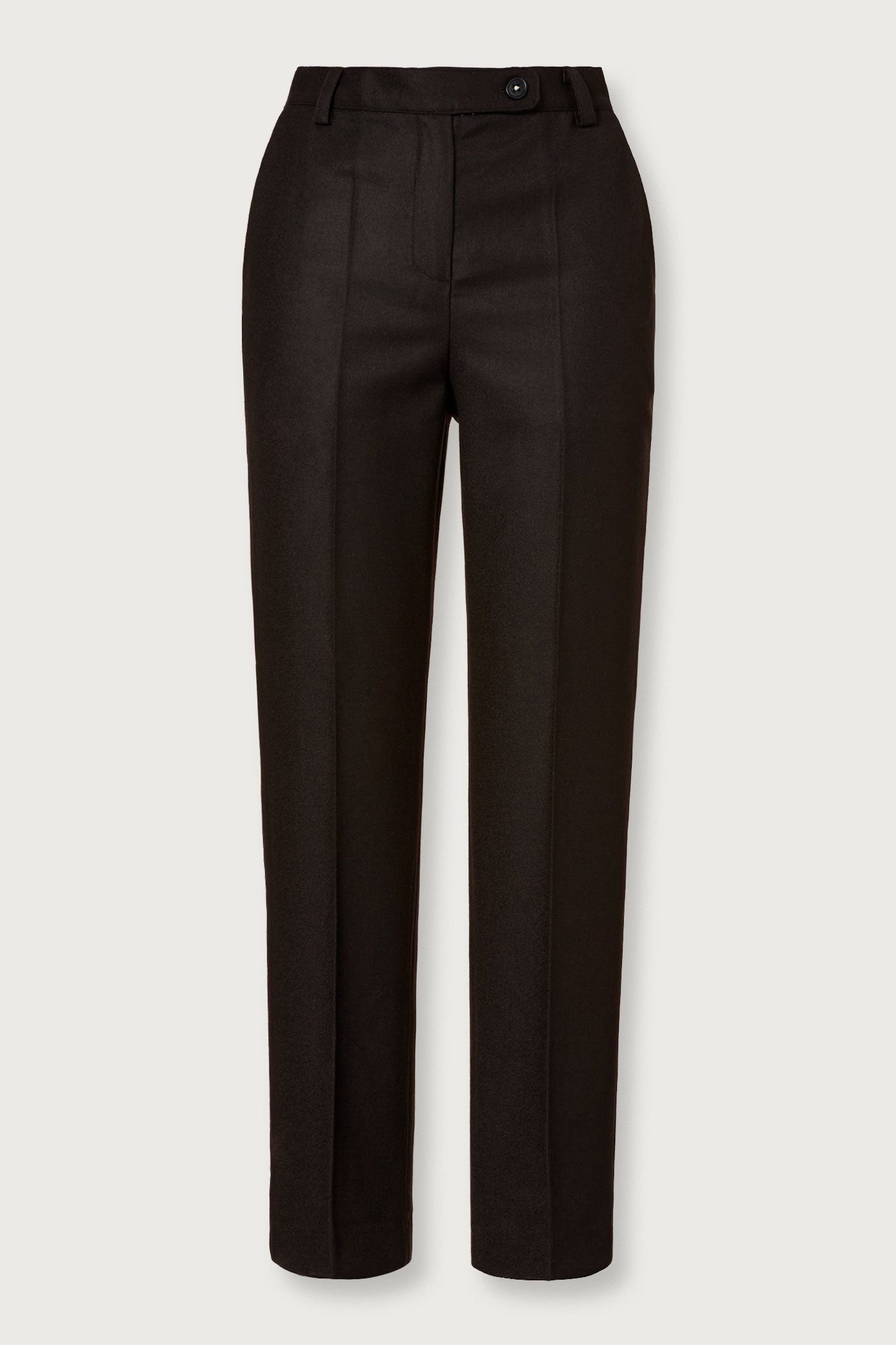 Tapered-leg trousers with a classic fit, tab button and zip closure, mid-rise waist and 16 cm leg opening. Crafted from melange virgin wool flannel. Made in Italy.