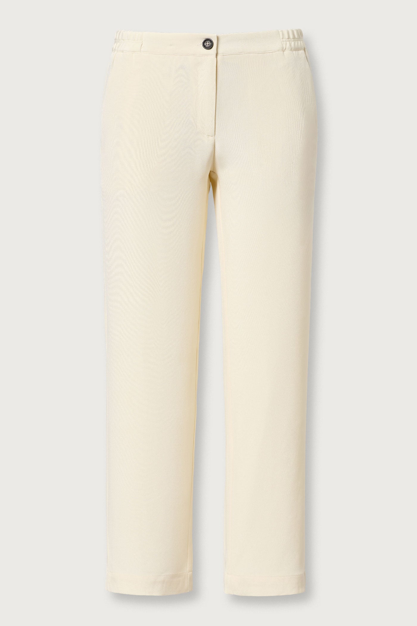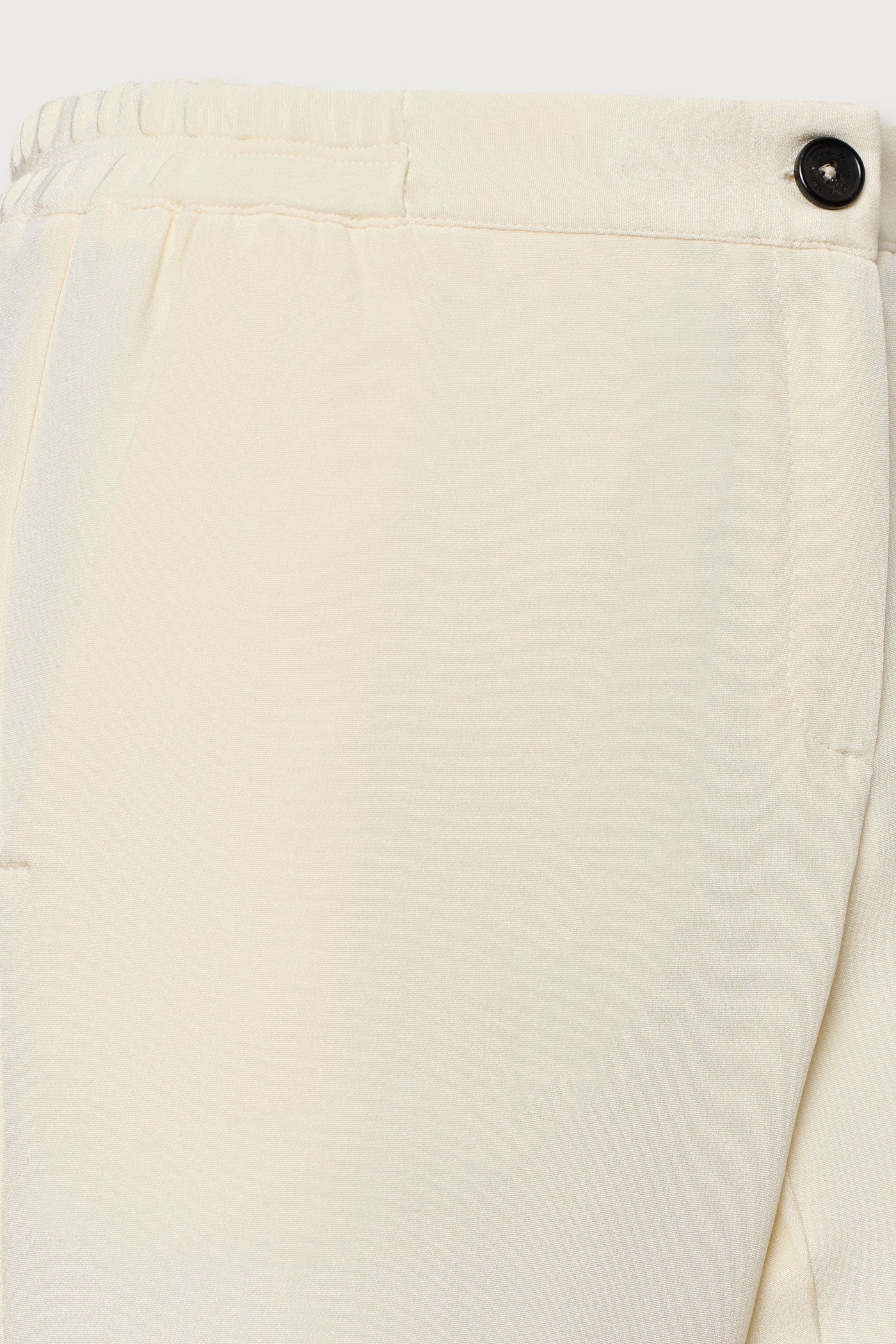 Classic-fit trousers, elastic waistband, front French pockets, back welt pockets, dark horn button and front zipper, ankle-length, made in silk. Made in Italy.