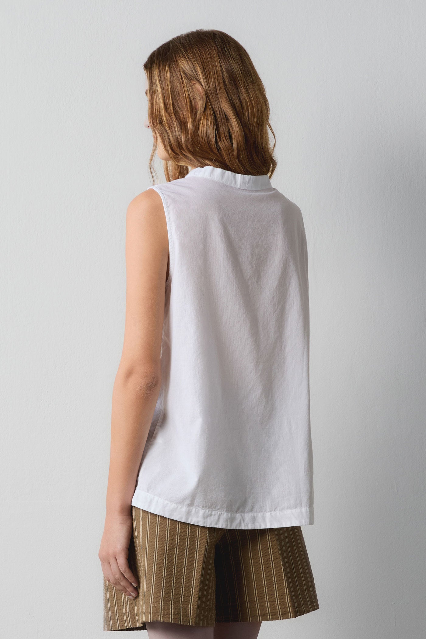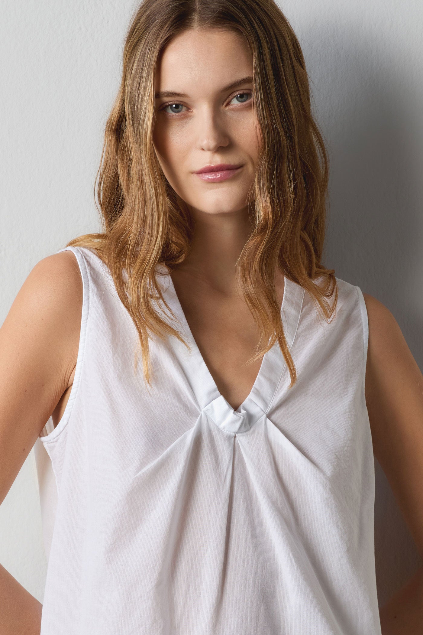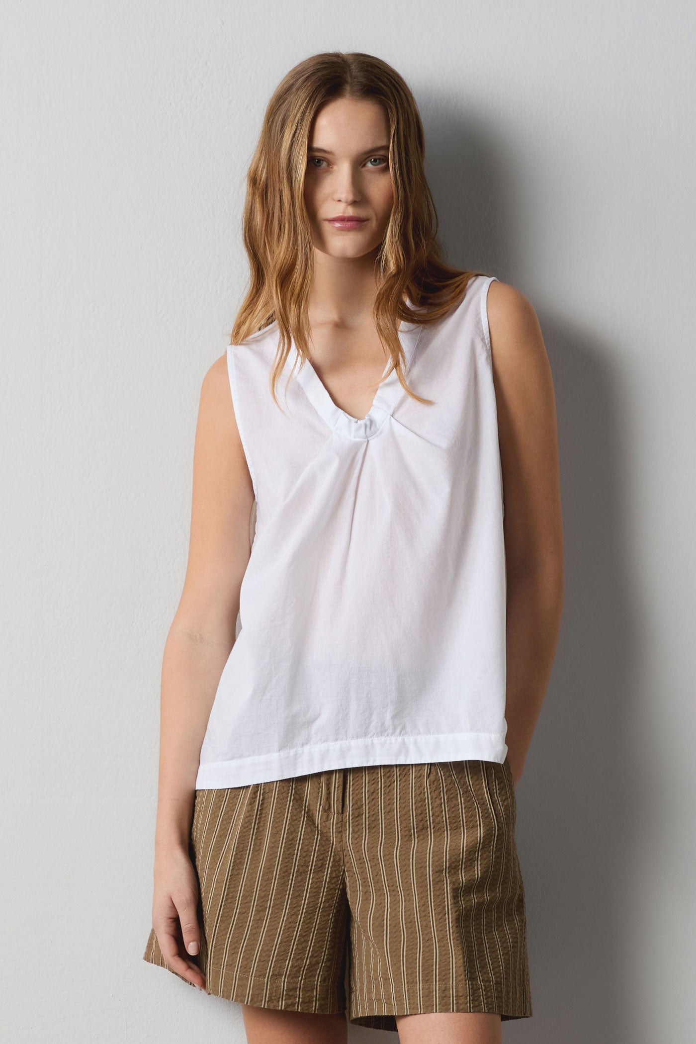 Sleeveless top crafted from textured cotton, featuring a V-neckline with a central gathered detail. Designed with a regular fit and clean finishing. A lightweight, versatile piece perfect for warm seasons. Made in Italy.