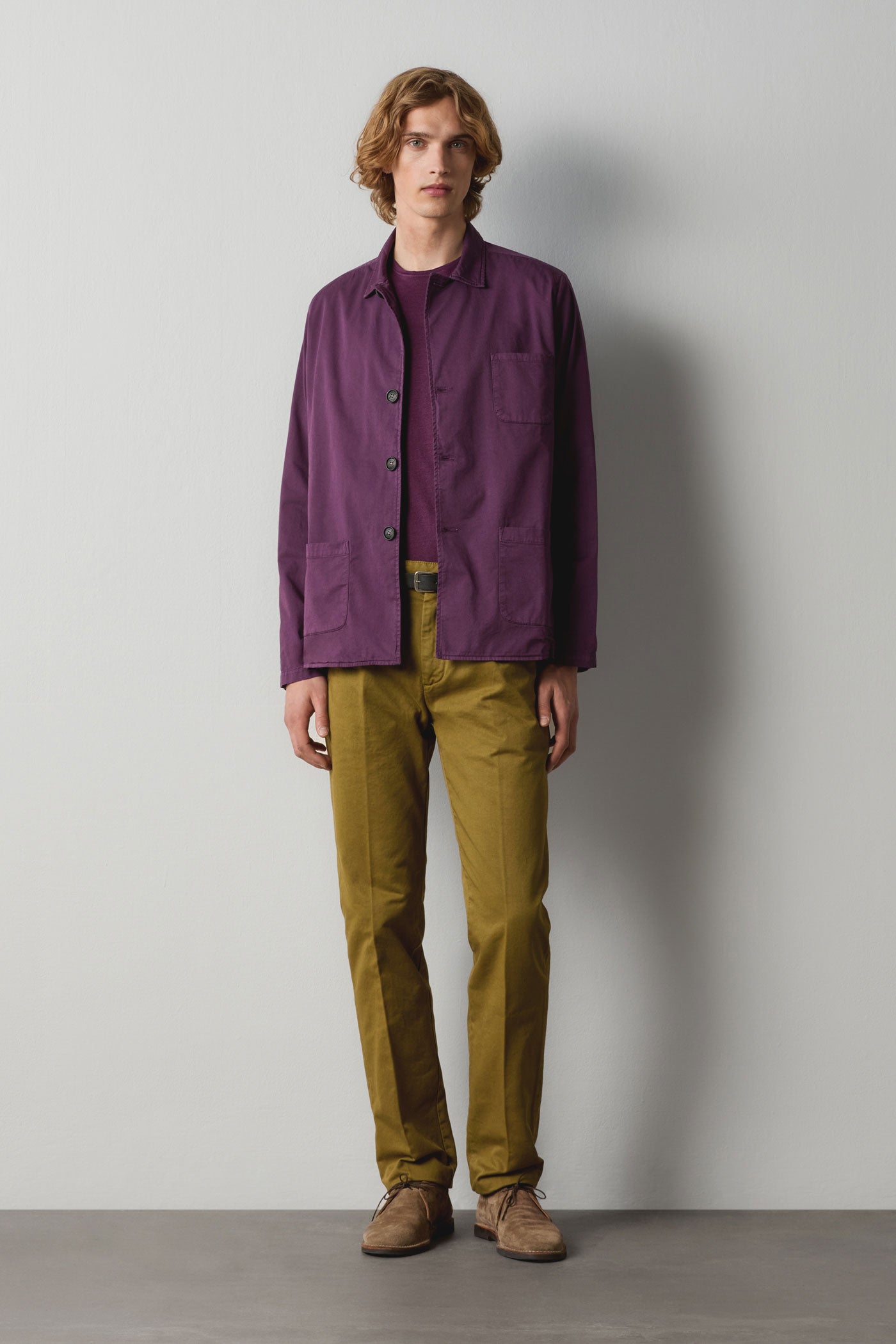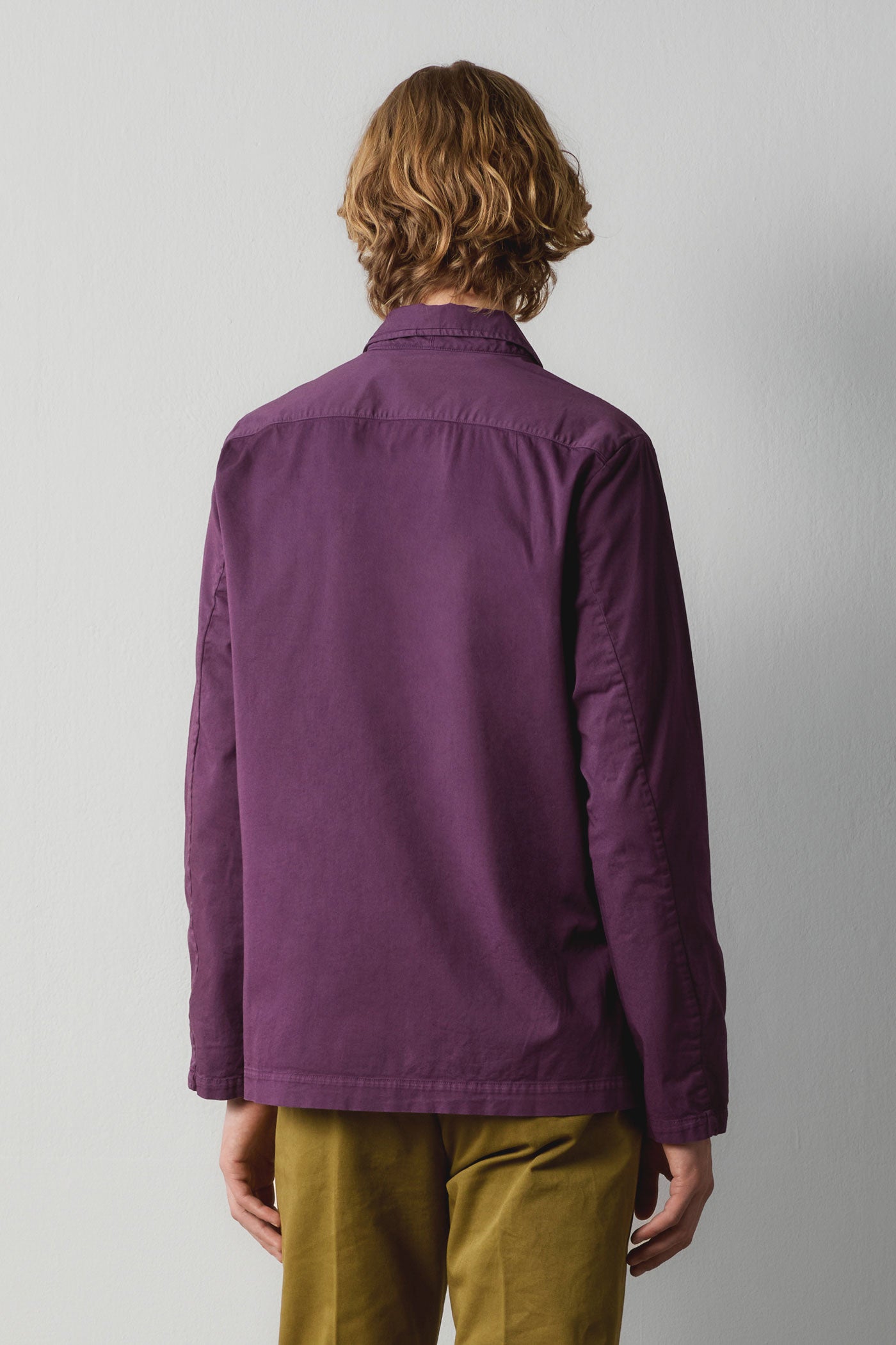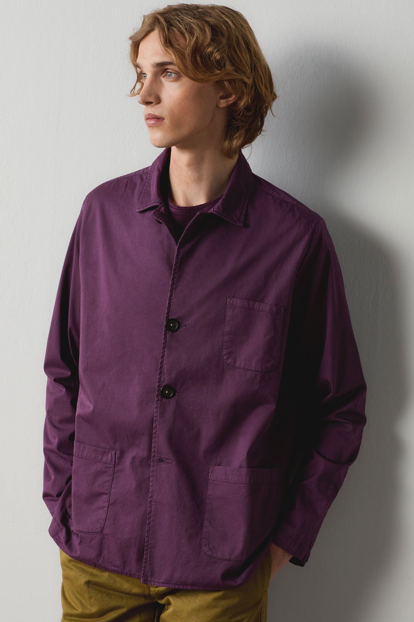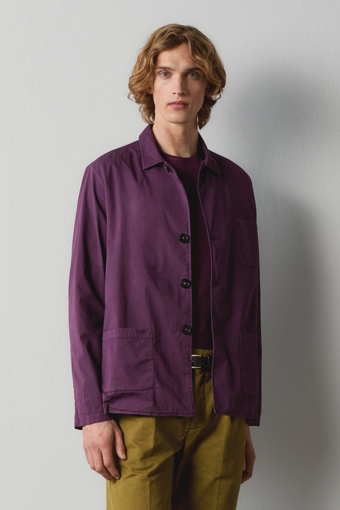 Giacca camicia monopetto con rever piccoli, tre bottoni, tre tasche a toppa, realizzata in gabardine di cotone fresco. Made in Italy.