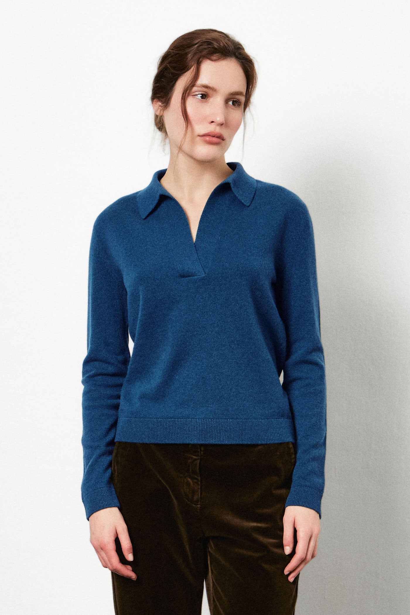 Polo in maglia rasata, maniche leggermente a campana, polso e fondo a coste piatte, realizzato in puro cashmere. Made in Italy.