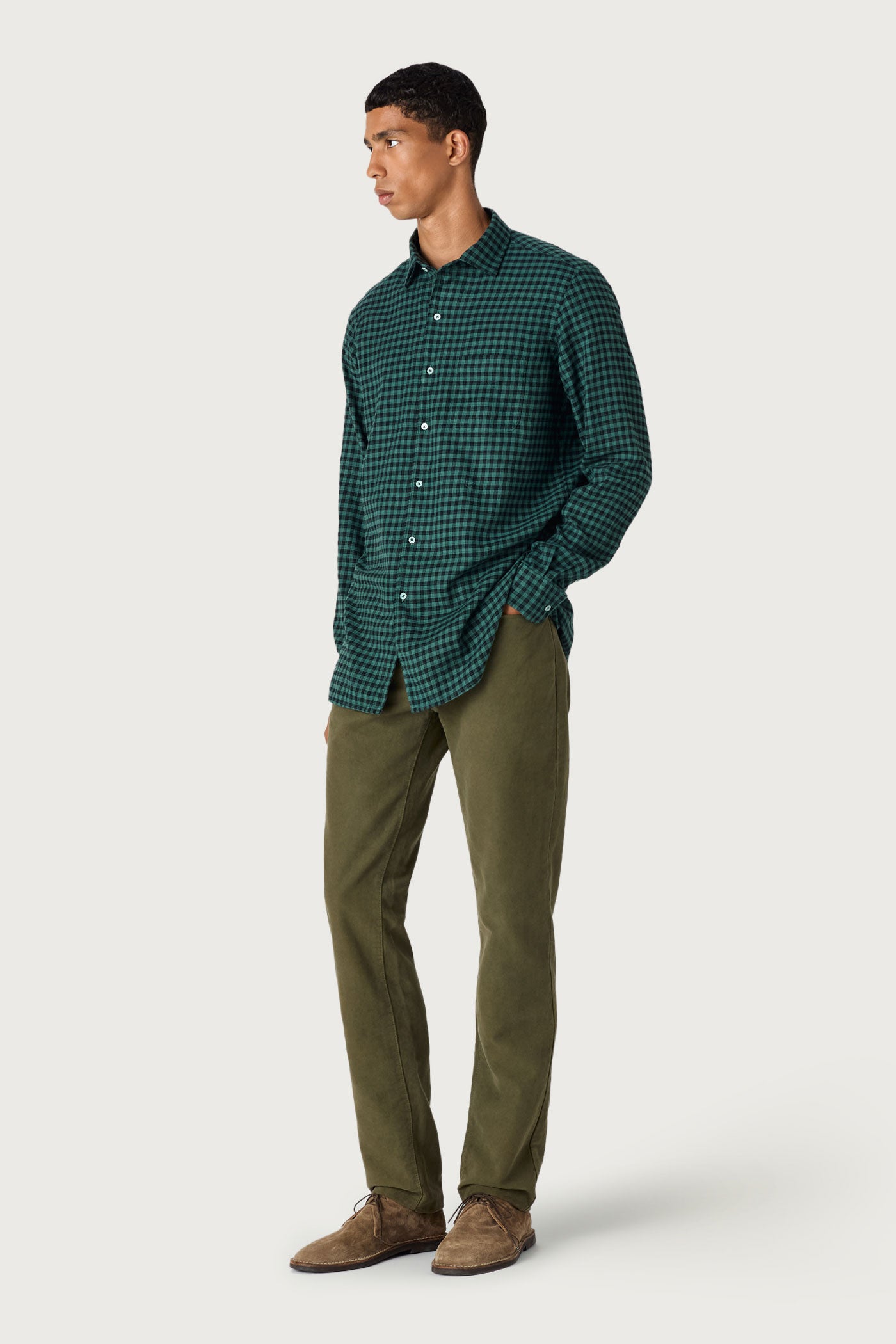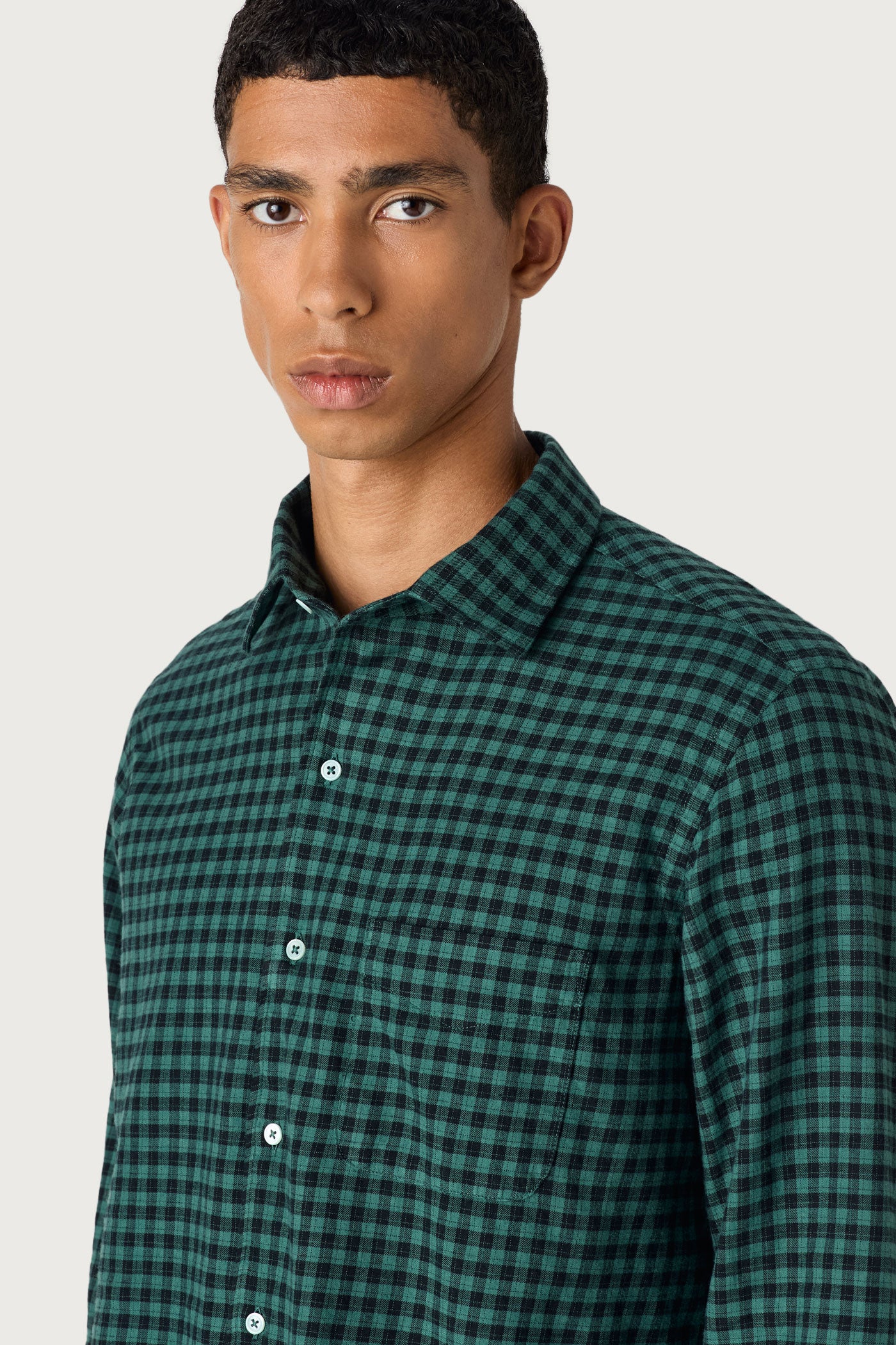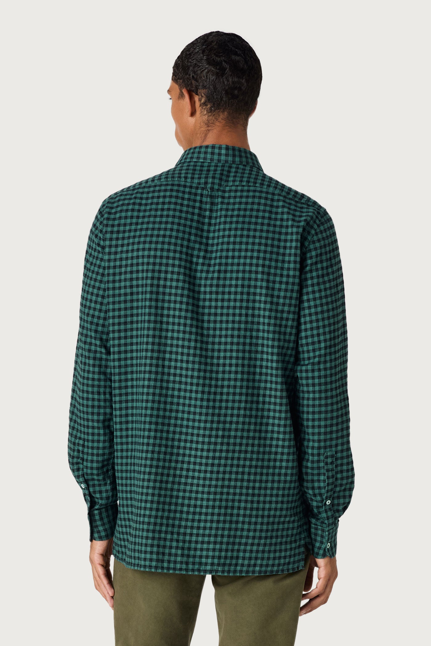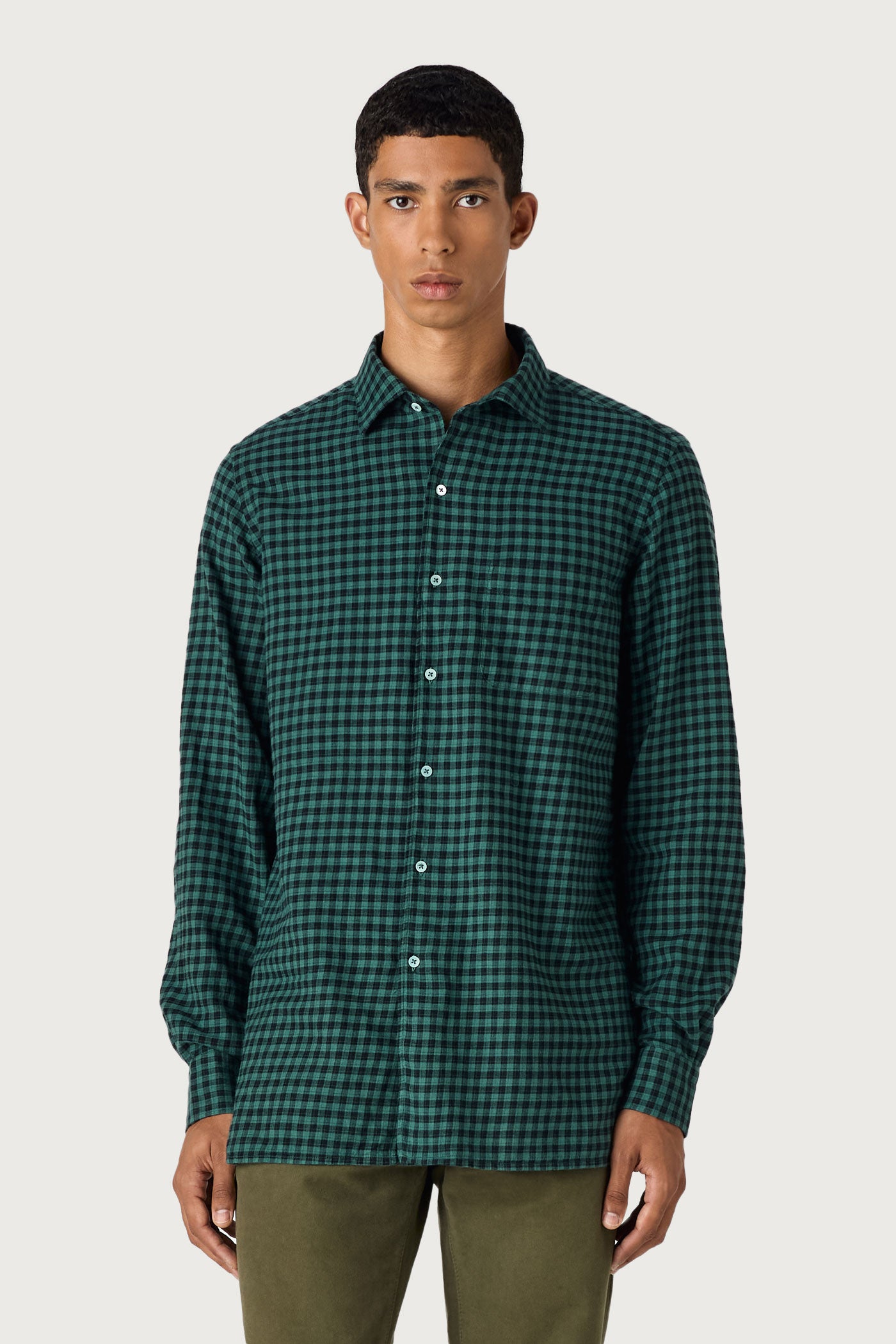 Camicia collo doppio uso, taschino, chiusura sul davanti con bottoni in madreperla, dettaglio della pettorina interna in voile di cotone e ricamo scudetto per apporre le cifre, carrè posteriore a punta, vestibilità morbida, realizzata in flanella di cotone. Made in Italy.