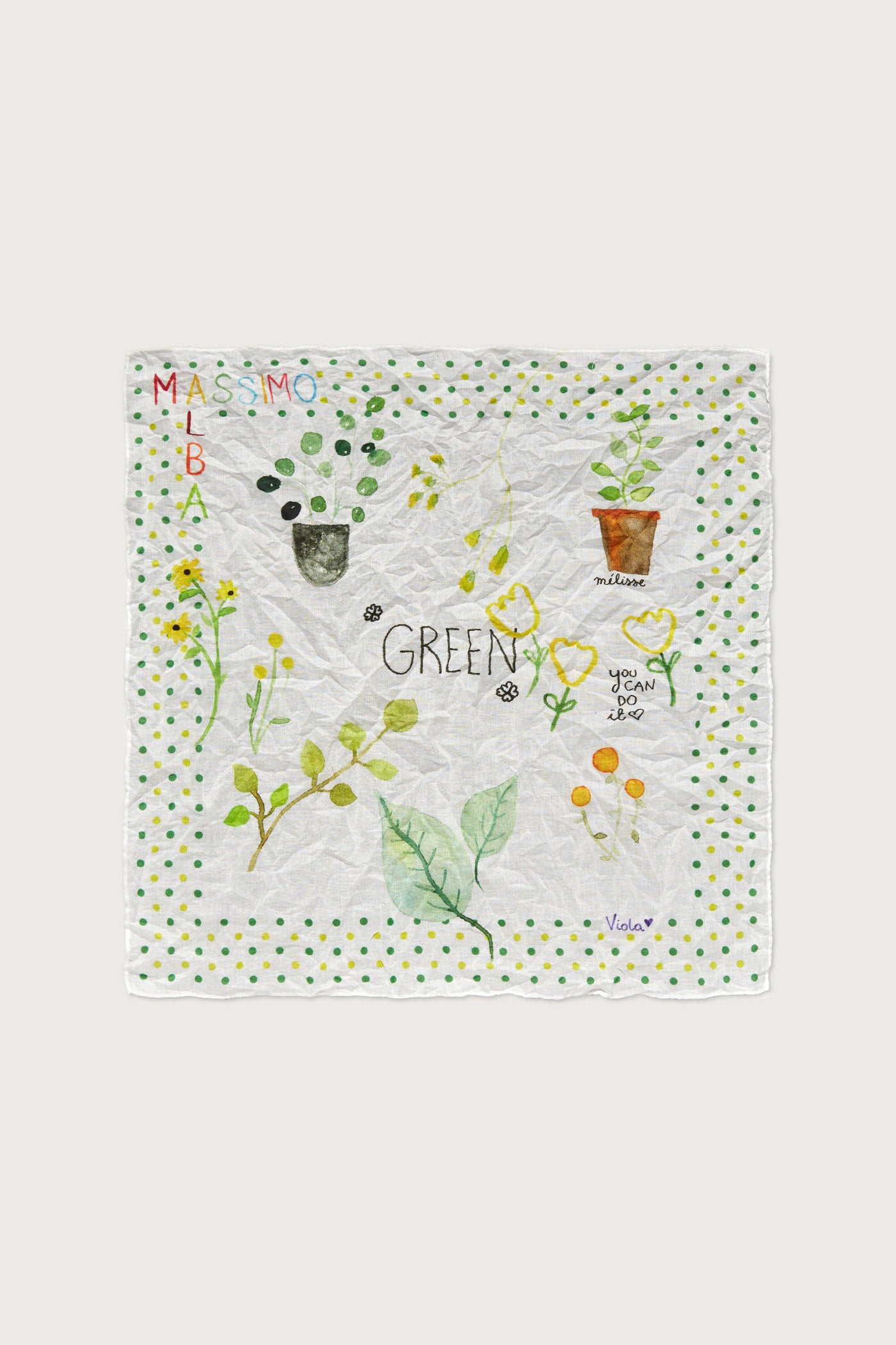 Fazzoletto in voile di cotone stampato con disegno esclusivo dell'artista italiana Viola Lupi. 45 x 45 cm. Made in Italy