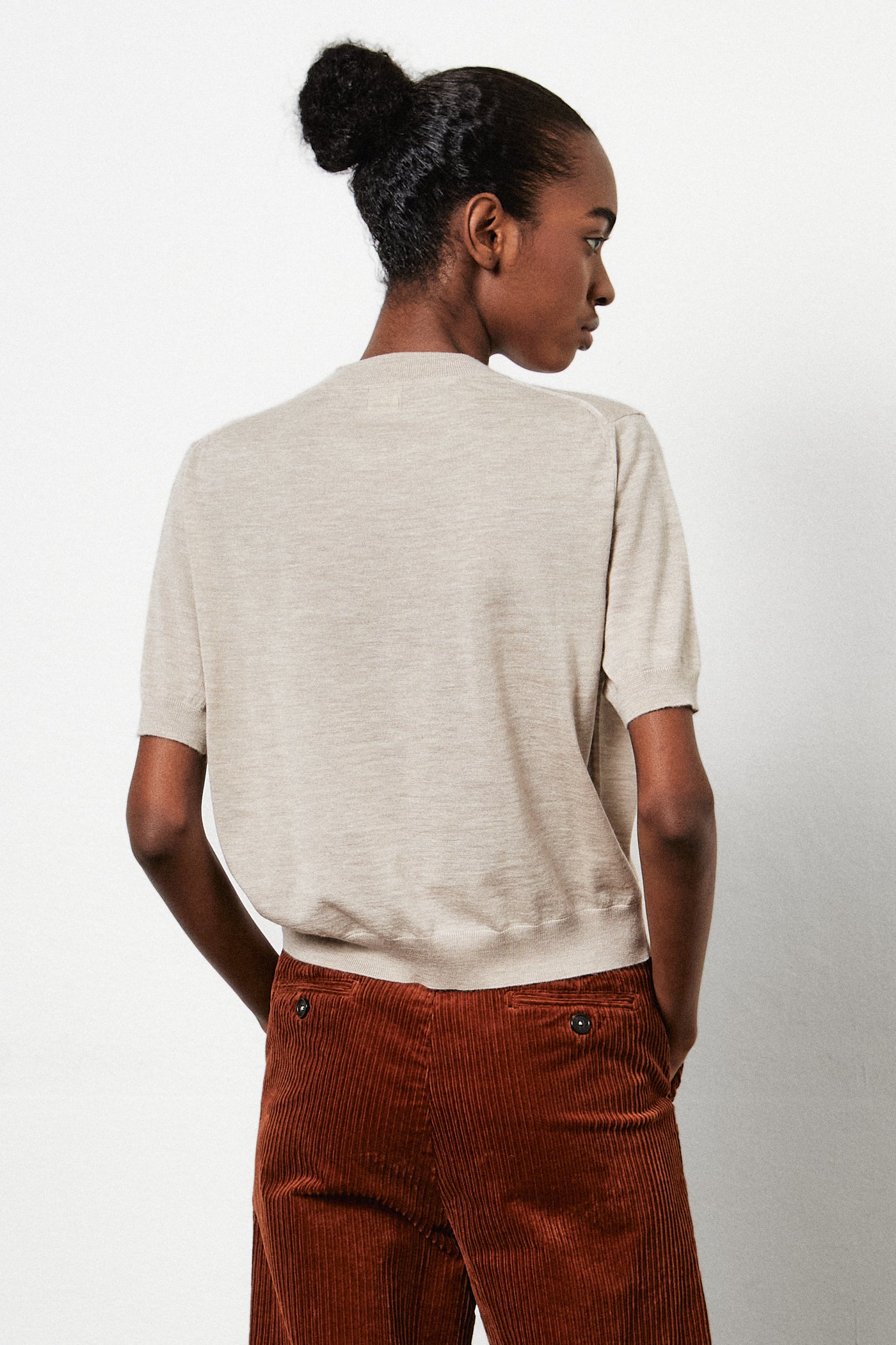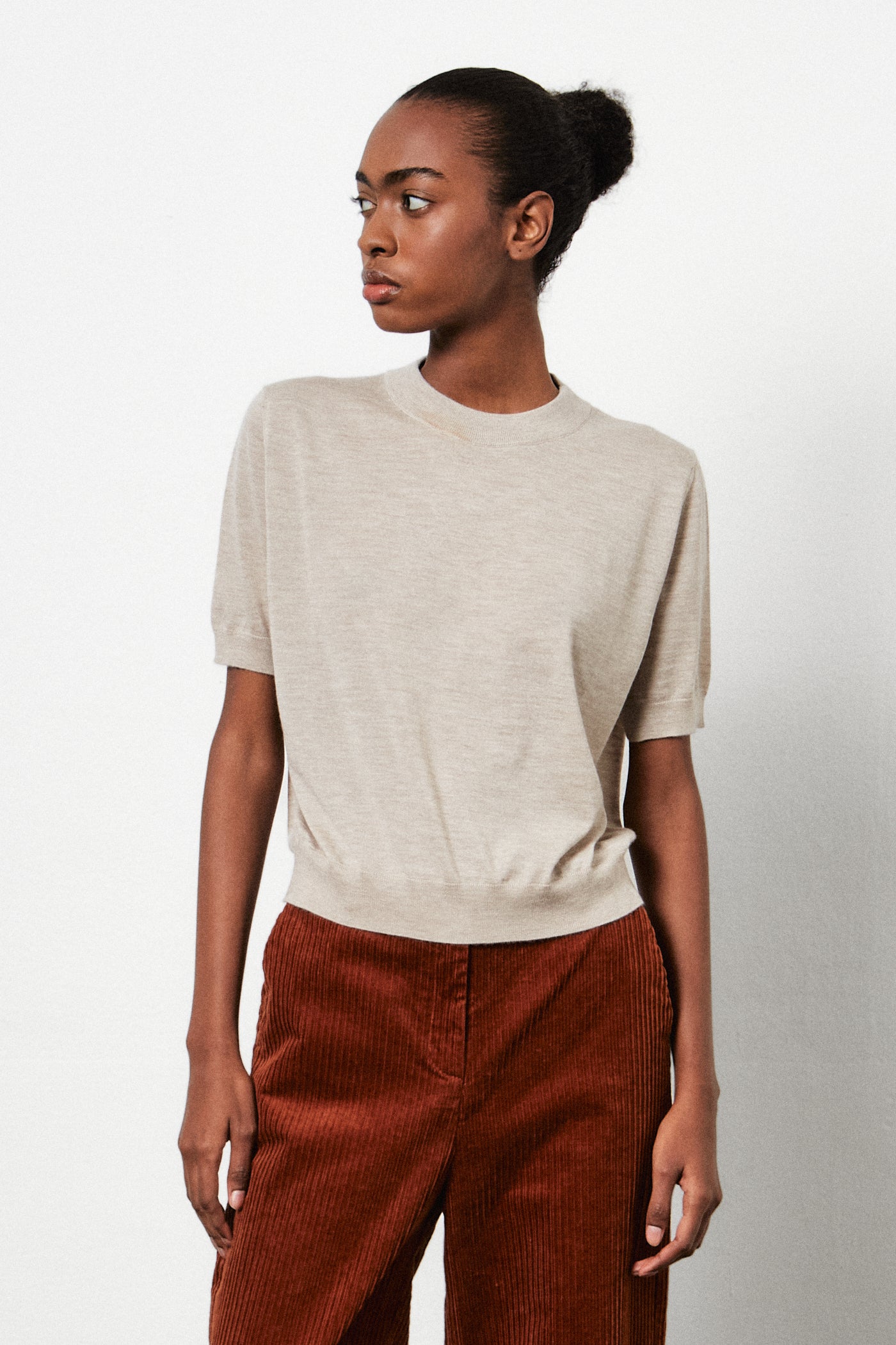 T-shirt in maglia rasata, vestibilità boxy, spalla scesa, realizzata in extrafine cashmere. Made in Italy.