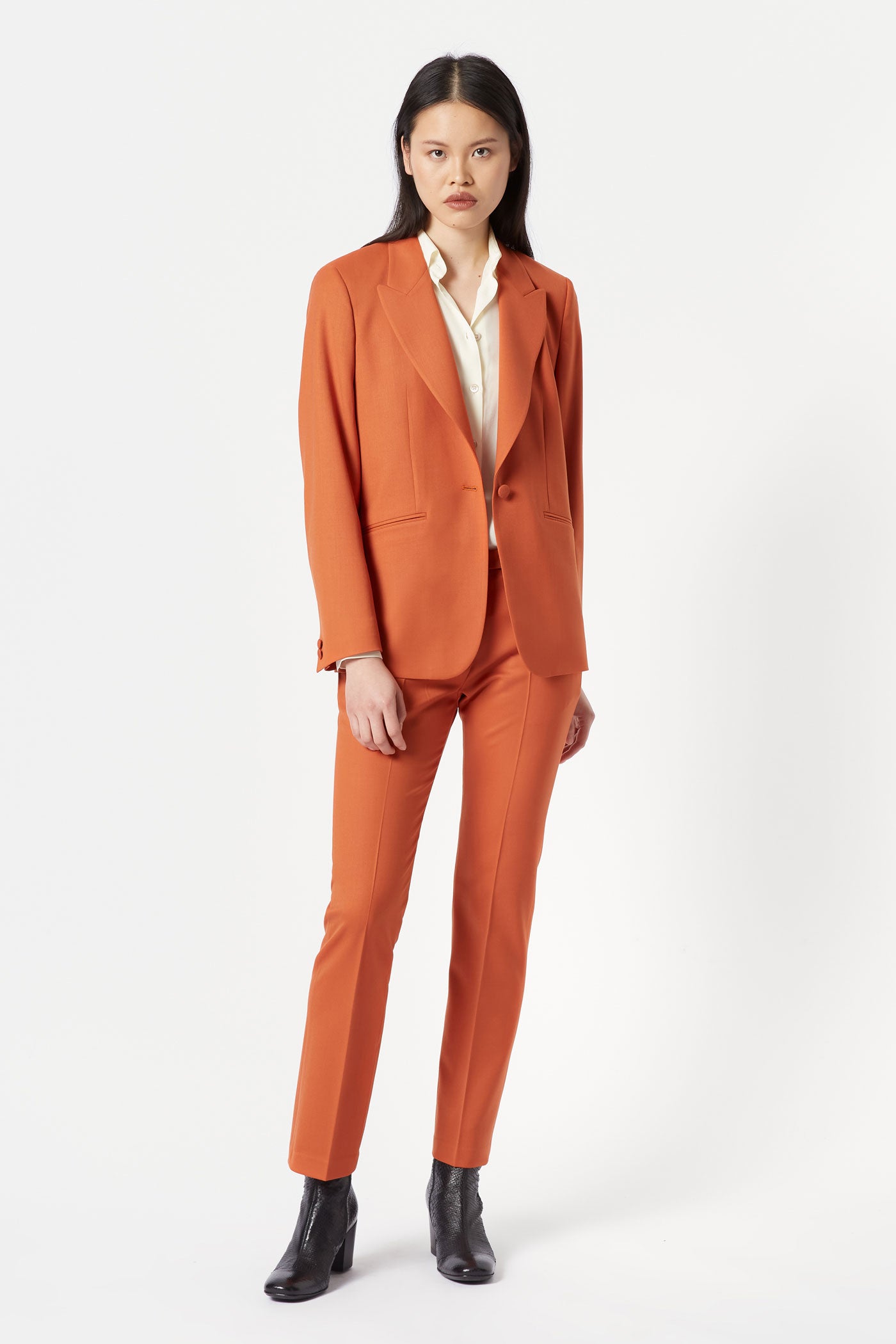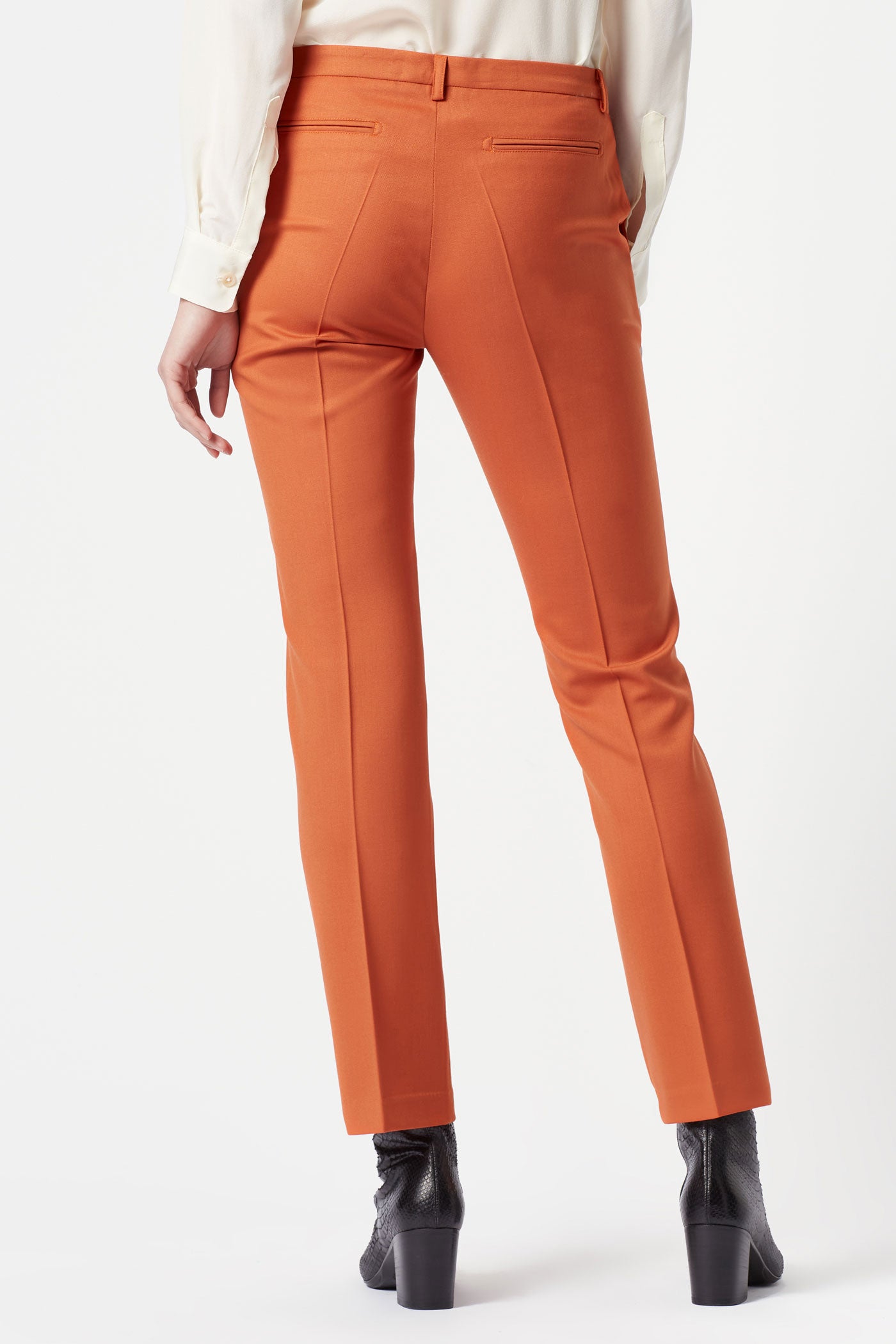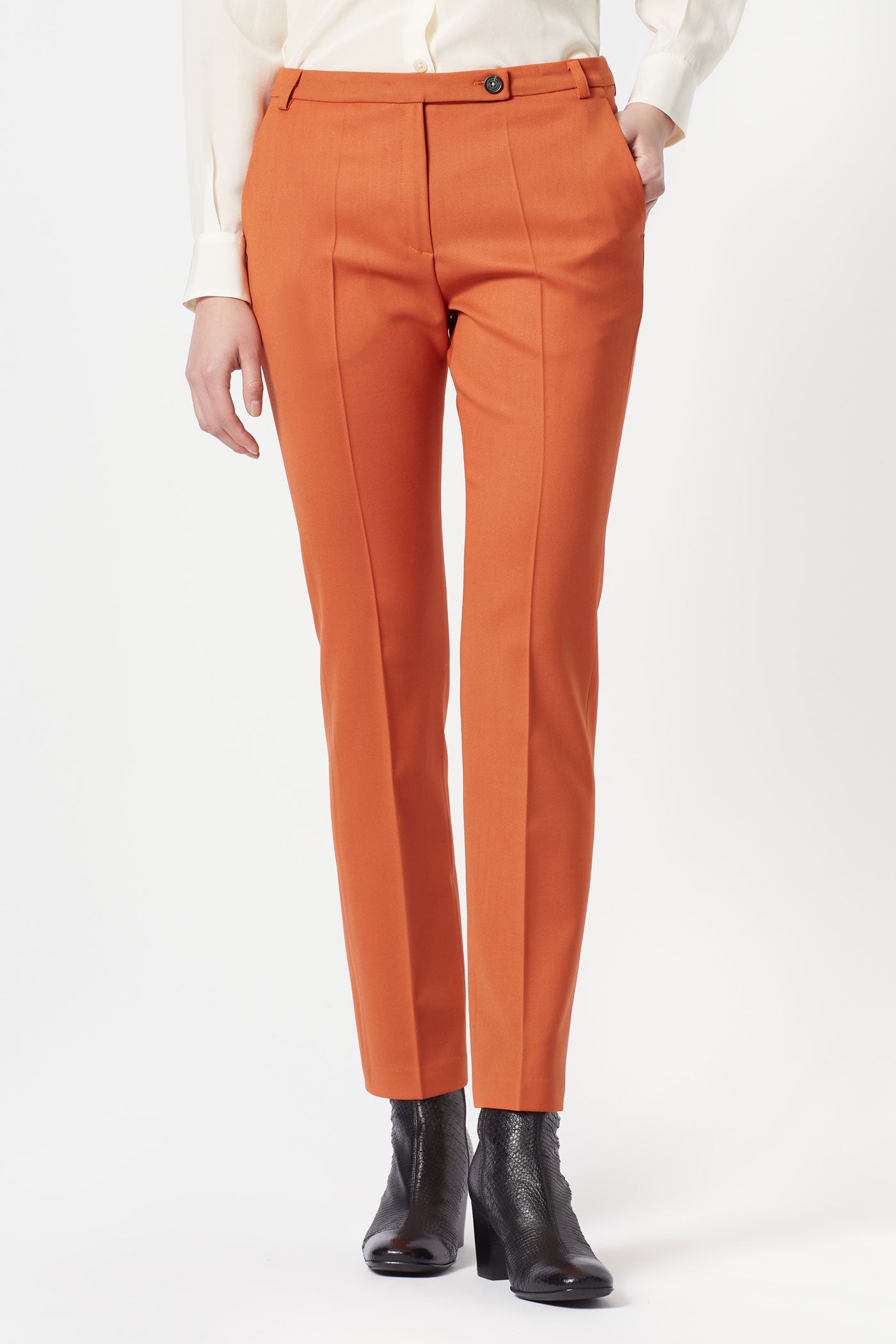 Pantaloni vita media, ventre piatto, vestibilità skinny, tasche inclinate, chiusura zip più linguetta con bottone realizzati twill di pura lana stretch. Made in Italy
