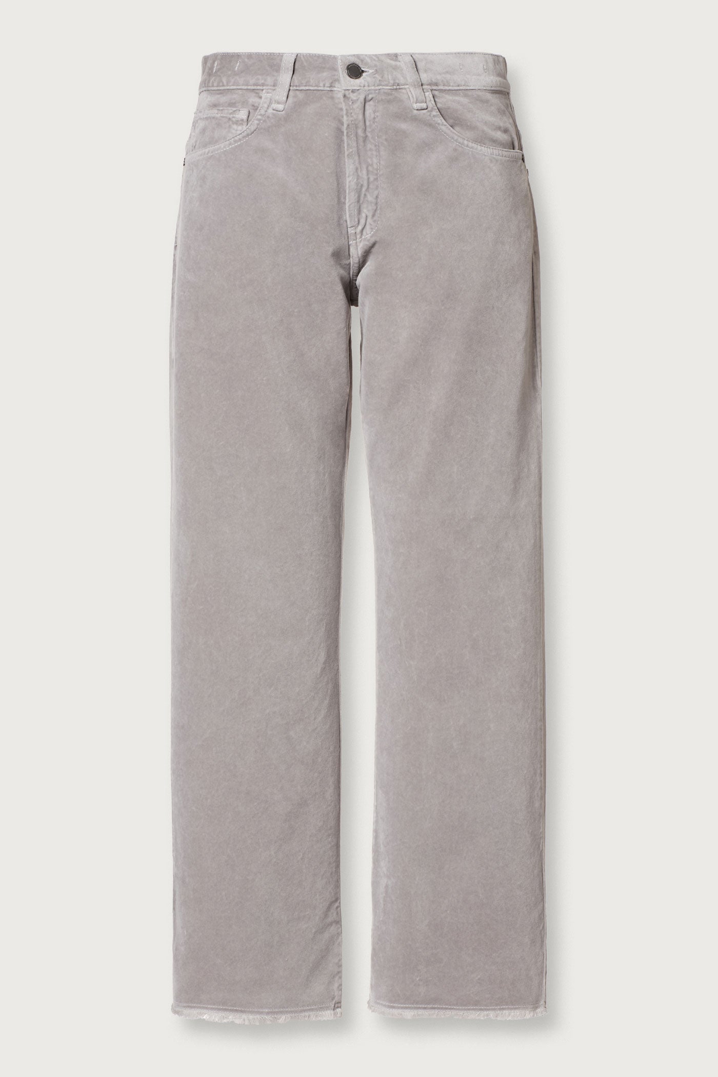 Pantaloni 5 tasche, gamba dritta, corto al malleolo con fondo sfrangiato dalla vestibilità morbida, chiusura con zip e bottone realizzati in velluto di puro cotone. Made in Italy.