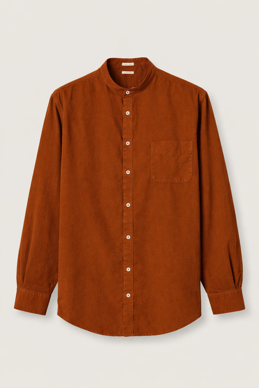 Camicia con collo guru, chiusura sul davanti con bottoni in madreperla, taschino, pettorina interna in voile di cotone e ricamo scudetto per apporre le iniziali, carrè posteriore a punta e fondo stondato, vestibilità regolare, realizzata in vellutino di cotone duemila-righe con effetto watercolor. Made in Italy.