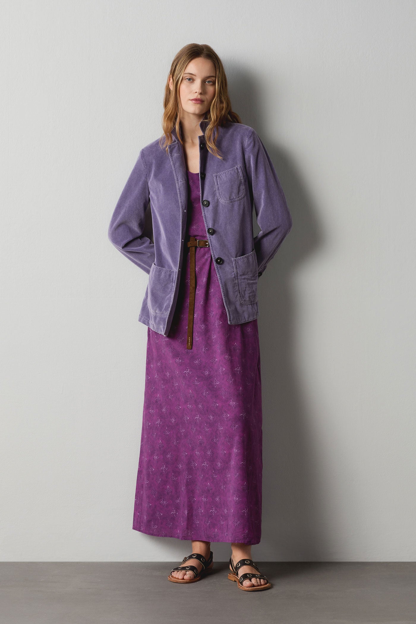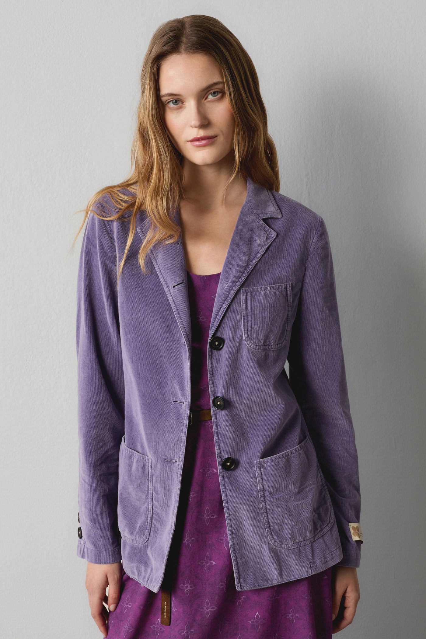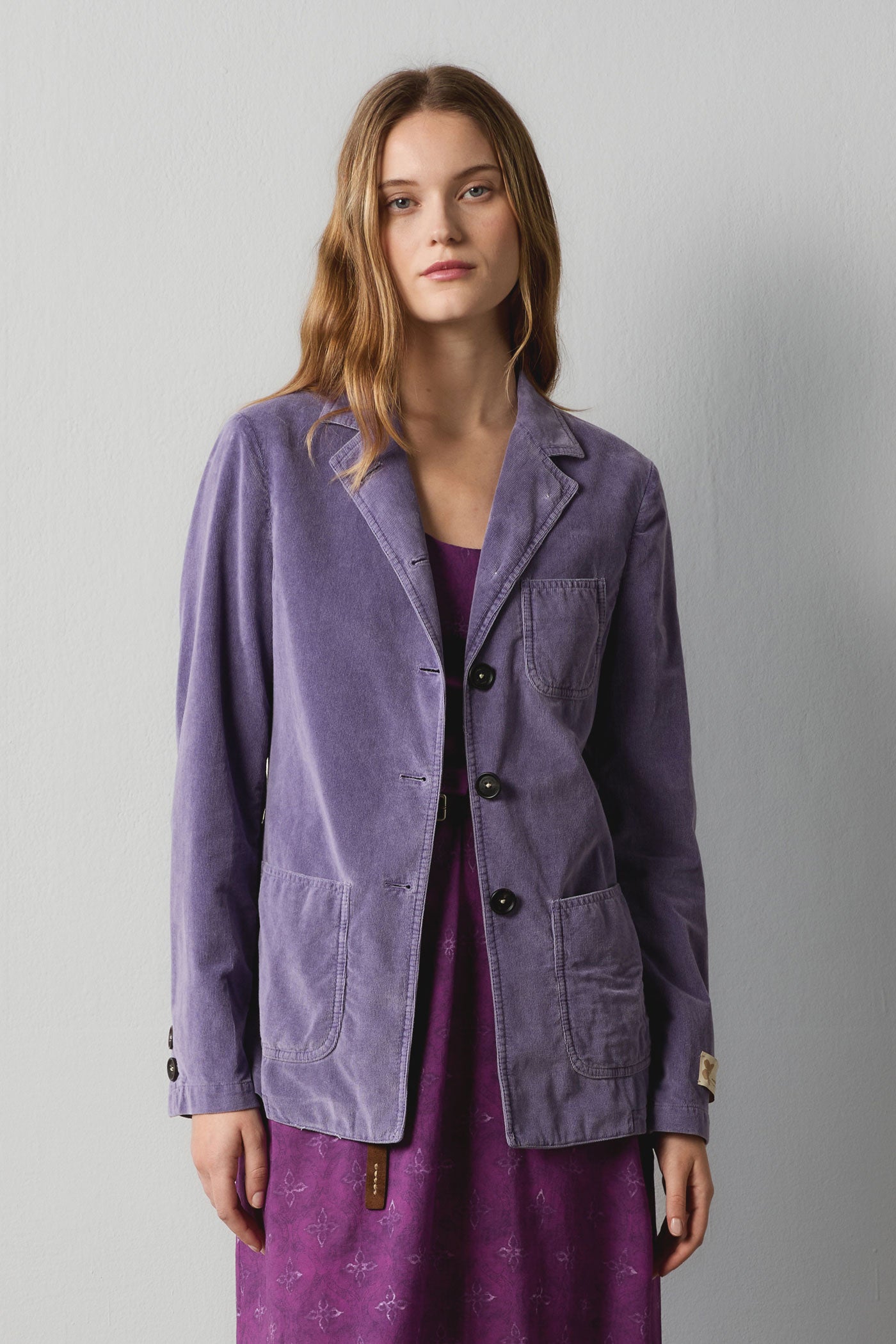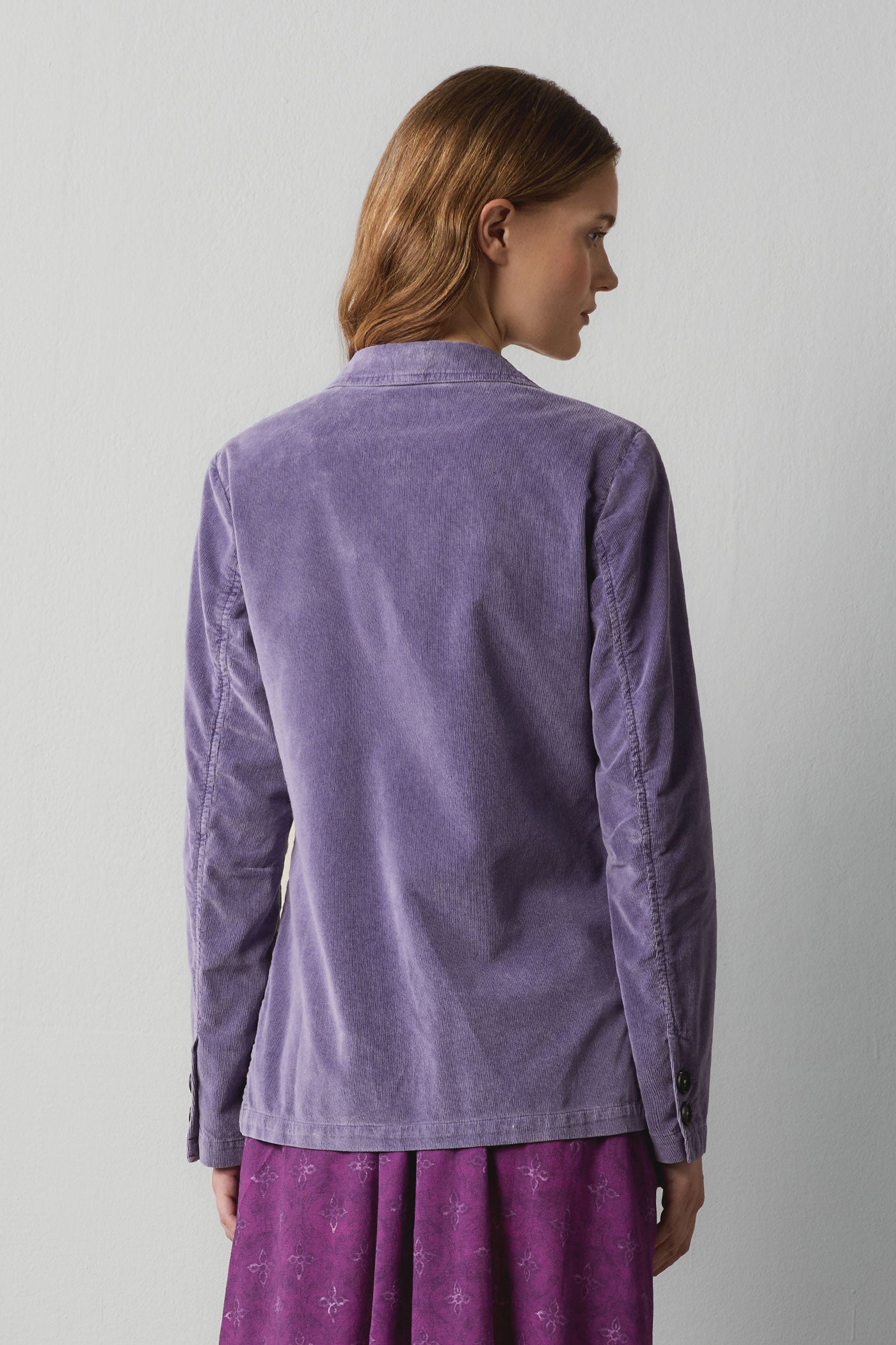 Single-breasted, iridescent watercolor baby corduroy jacket featuring an informal feel, four horn buttons, patch pockets, side slits. Made in Italy.