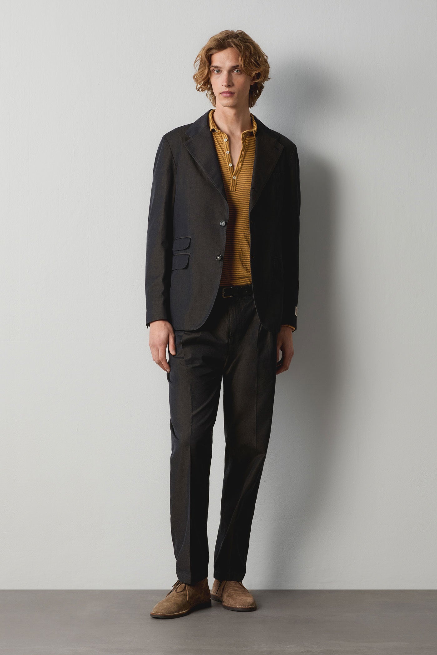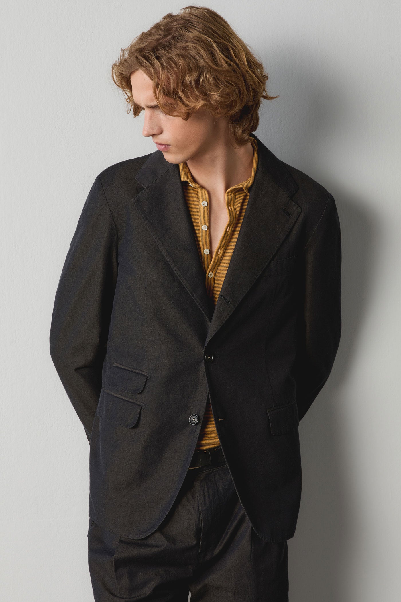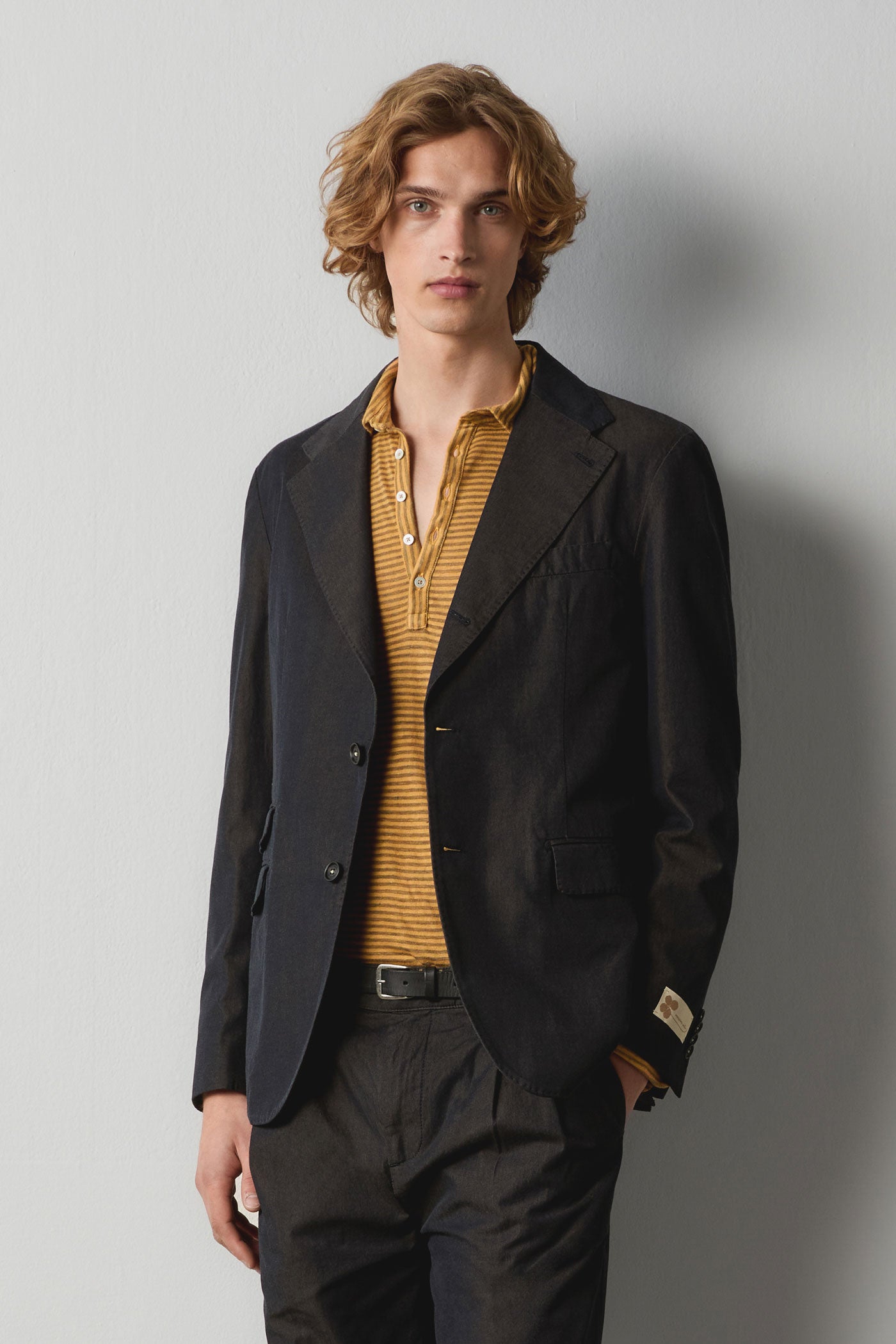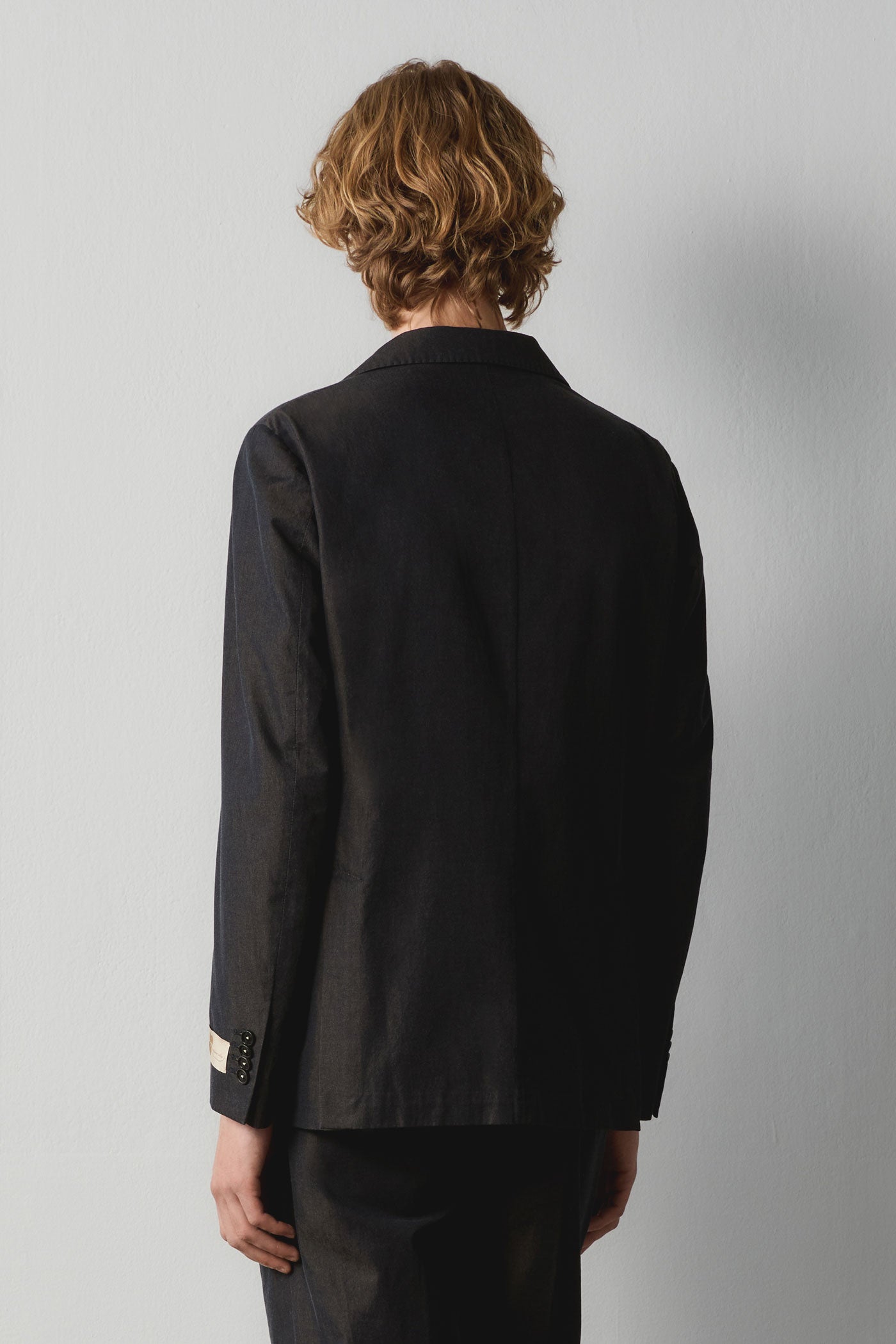Deconstructed jacket in cotton solaro fabric, featuring three buttons, classic stitched lapels, flap pockets, dark horn buttons, internal reinforcement with two pockets, and double back vents. Made in Italy.