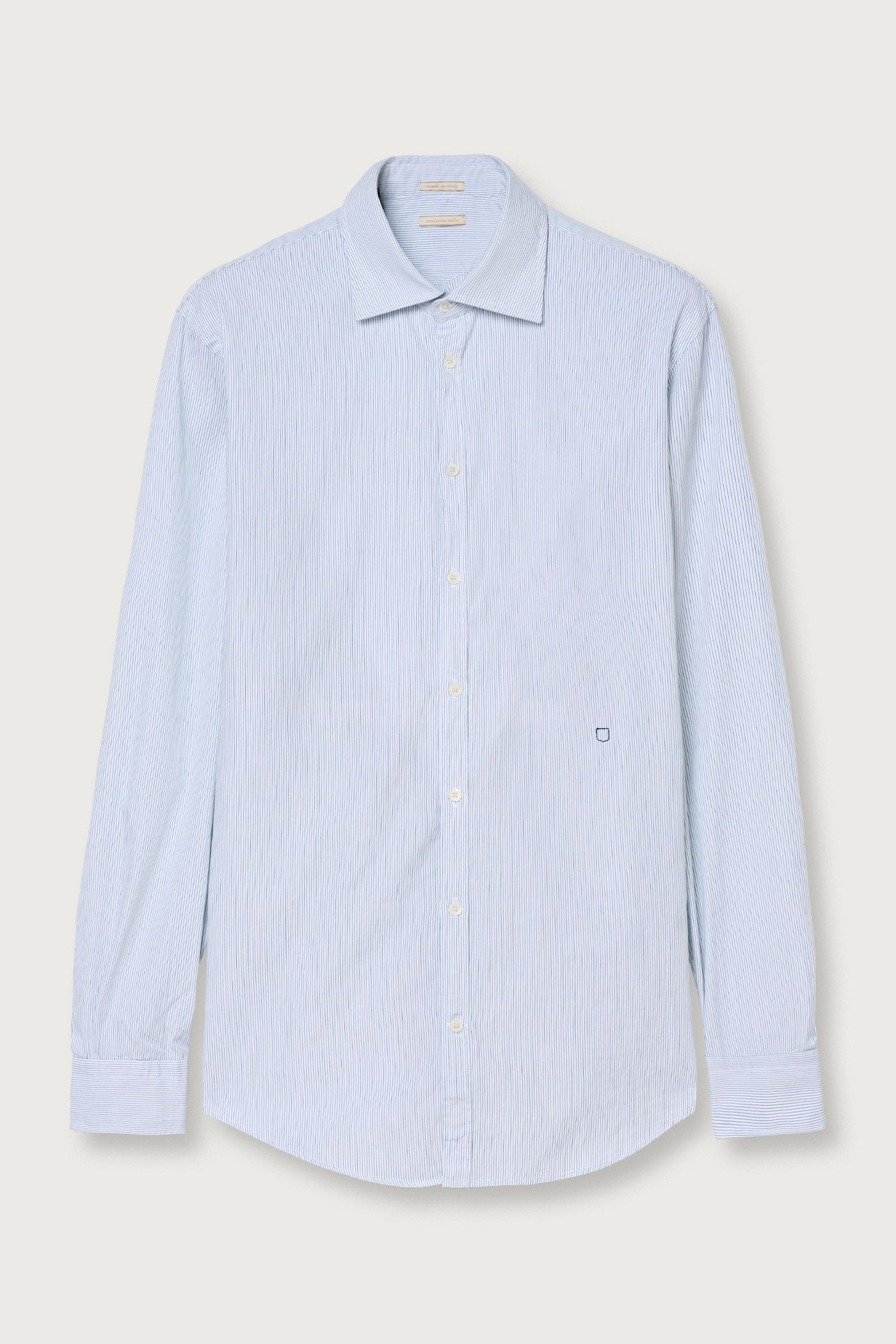 Regular-fit shirt with a pointed collar, classic soft front placket, and a cotton voilè inner bib. Made of cotton poplin. Features custom badge embroidery for initials and a pointed rear yoke. Made in Italy.