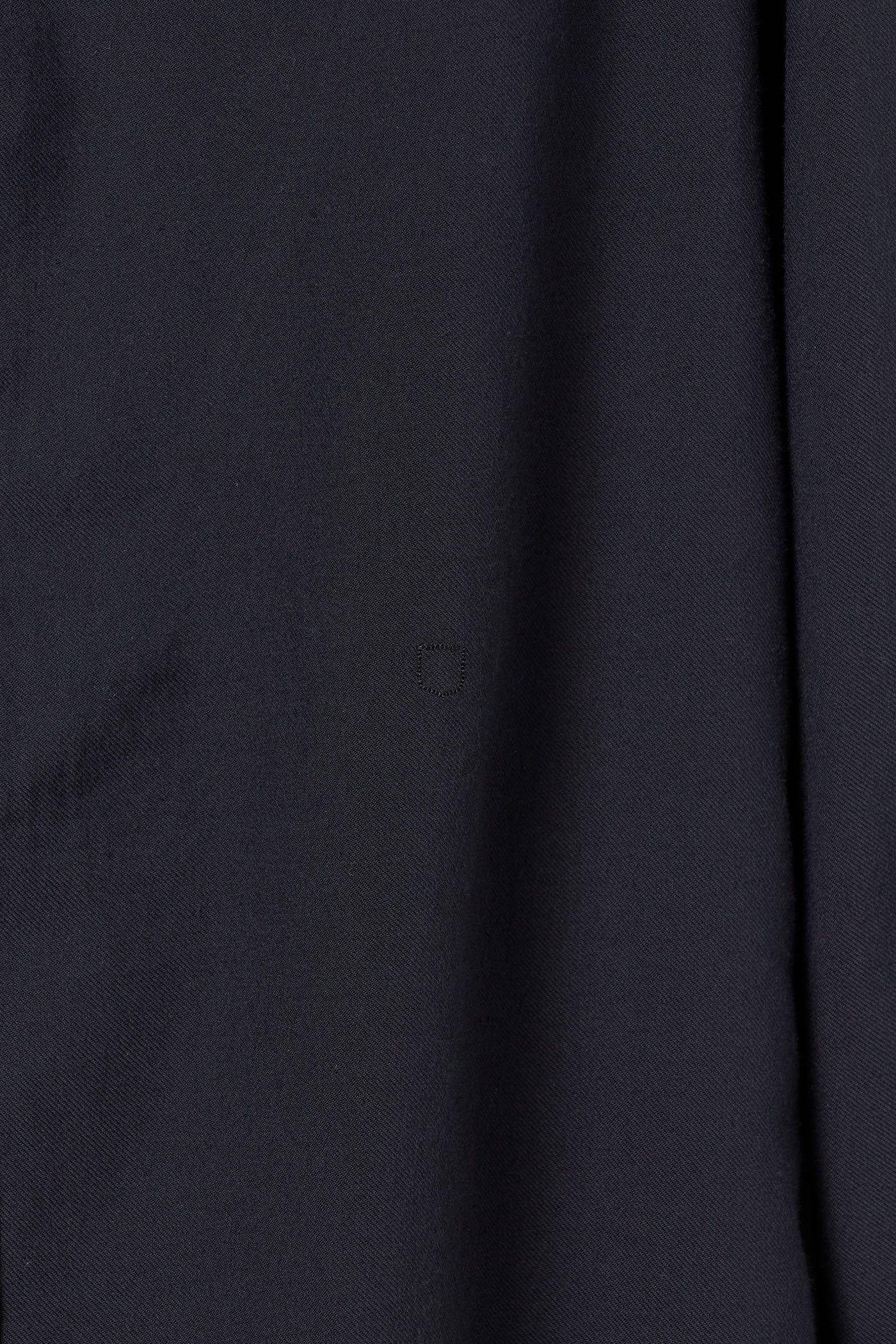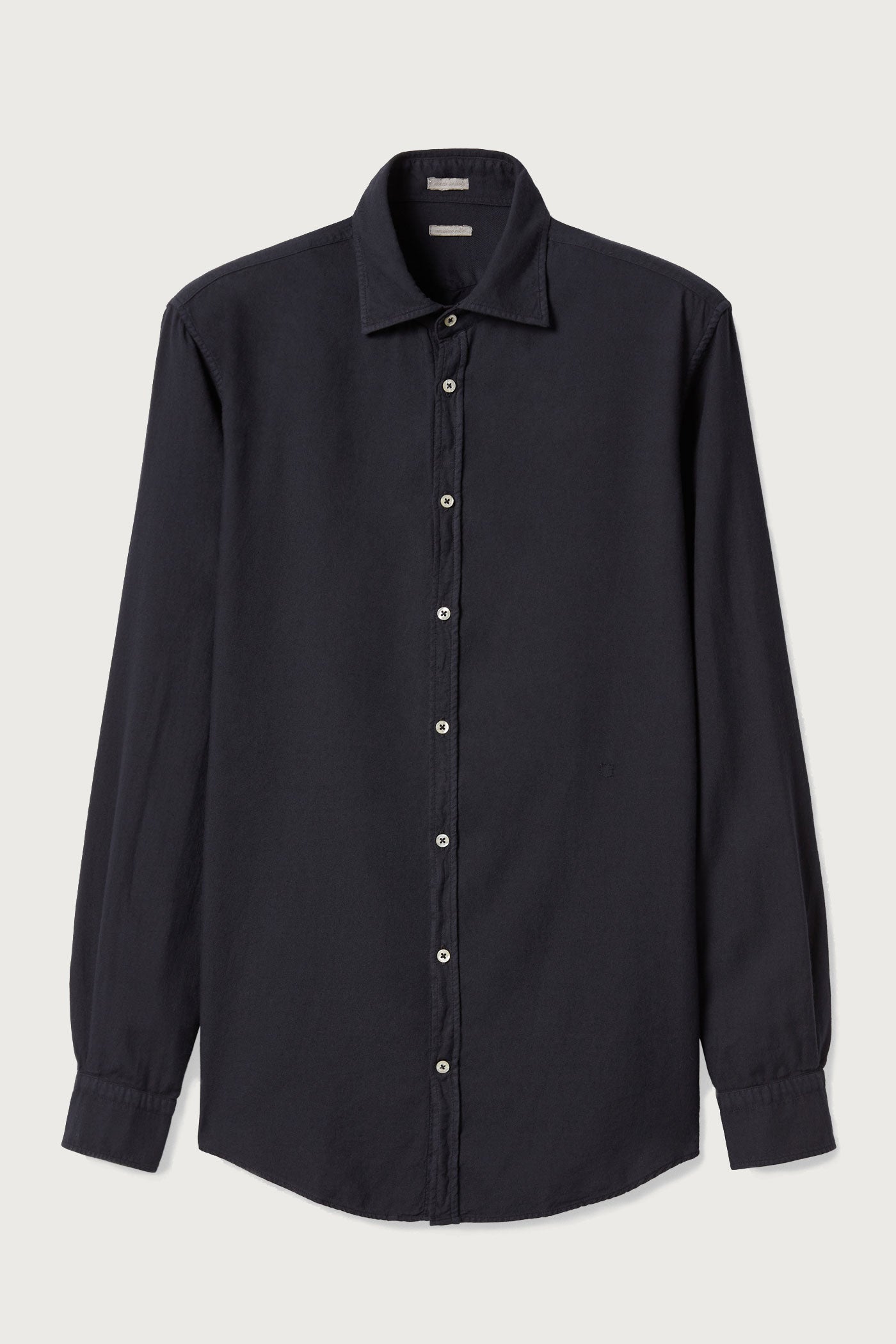 Shirt with pointed collar, front closure, cotton voile plastron detail and embroidered crest for numbering. Pointed back yoke with rounded hem. Regular fit. Crafted from viscose and cotton viyella. Made in Italy.