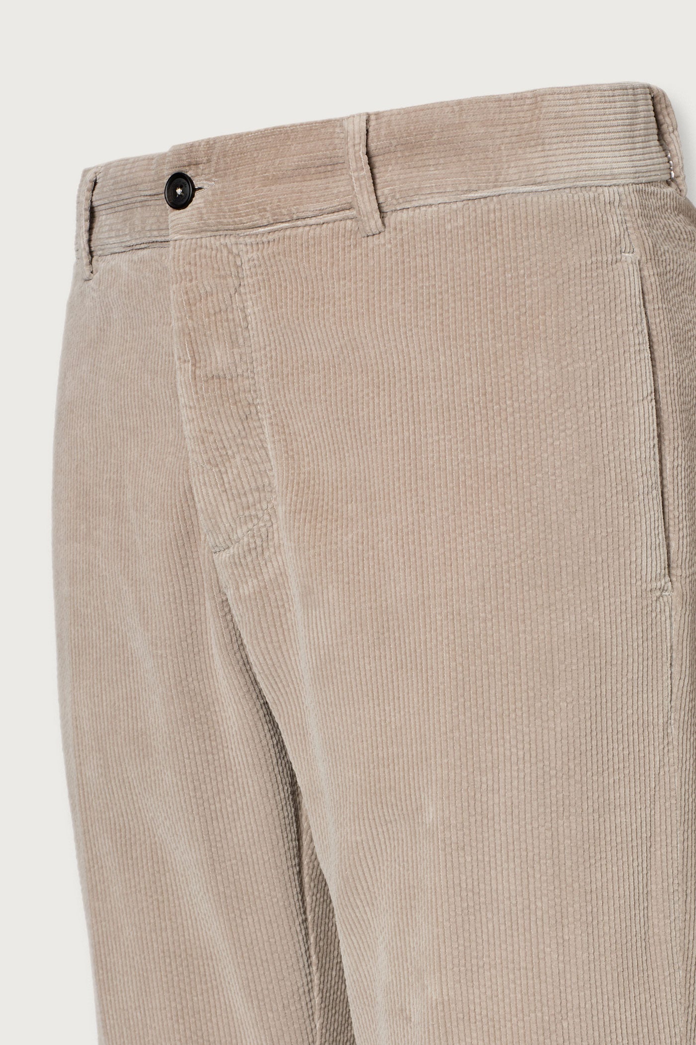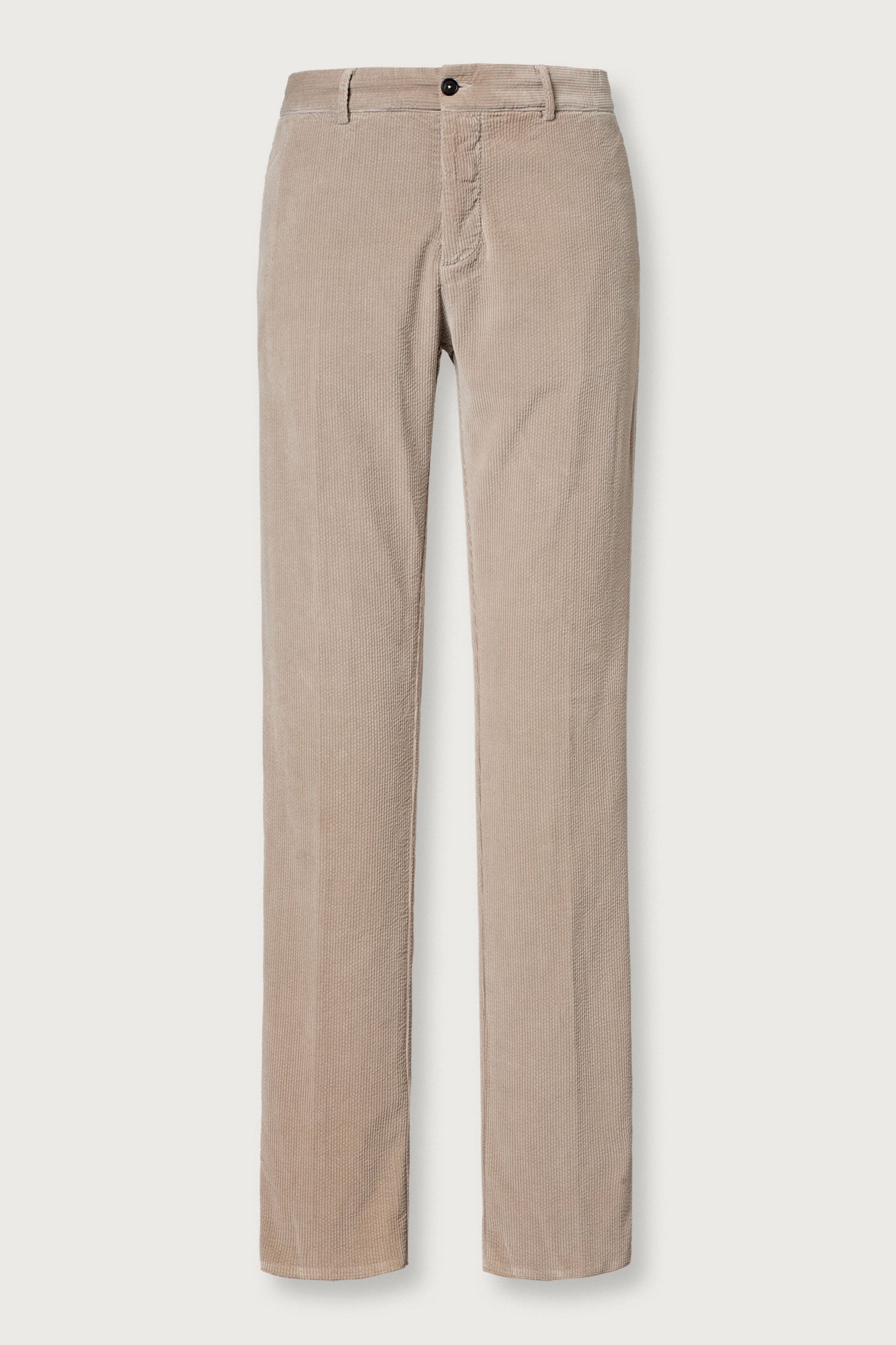 Slim-fit trousers with a flat front, featuring welt pockets, a front fastening with a tab and concealed zip with a dark horn button, and belt loops at the waist. Crafted from cotton corduroy. Made in Italy.