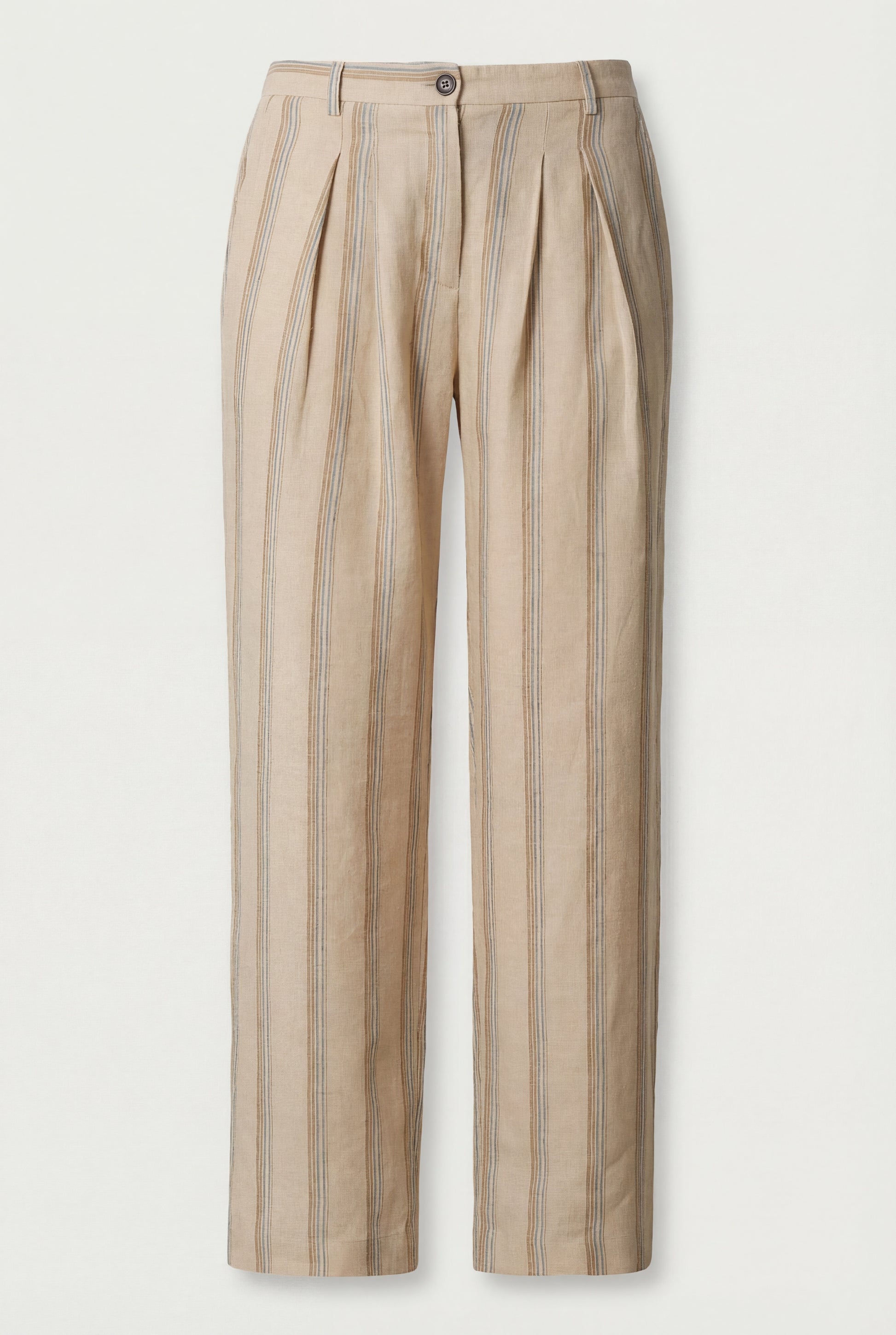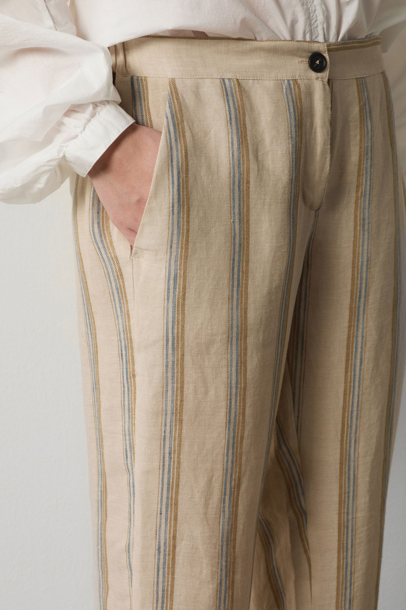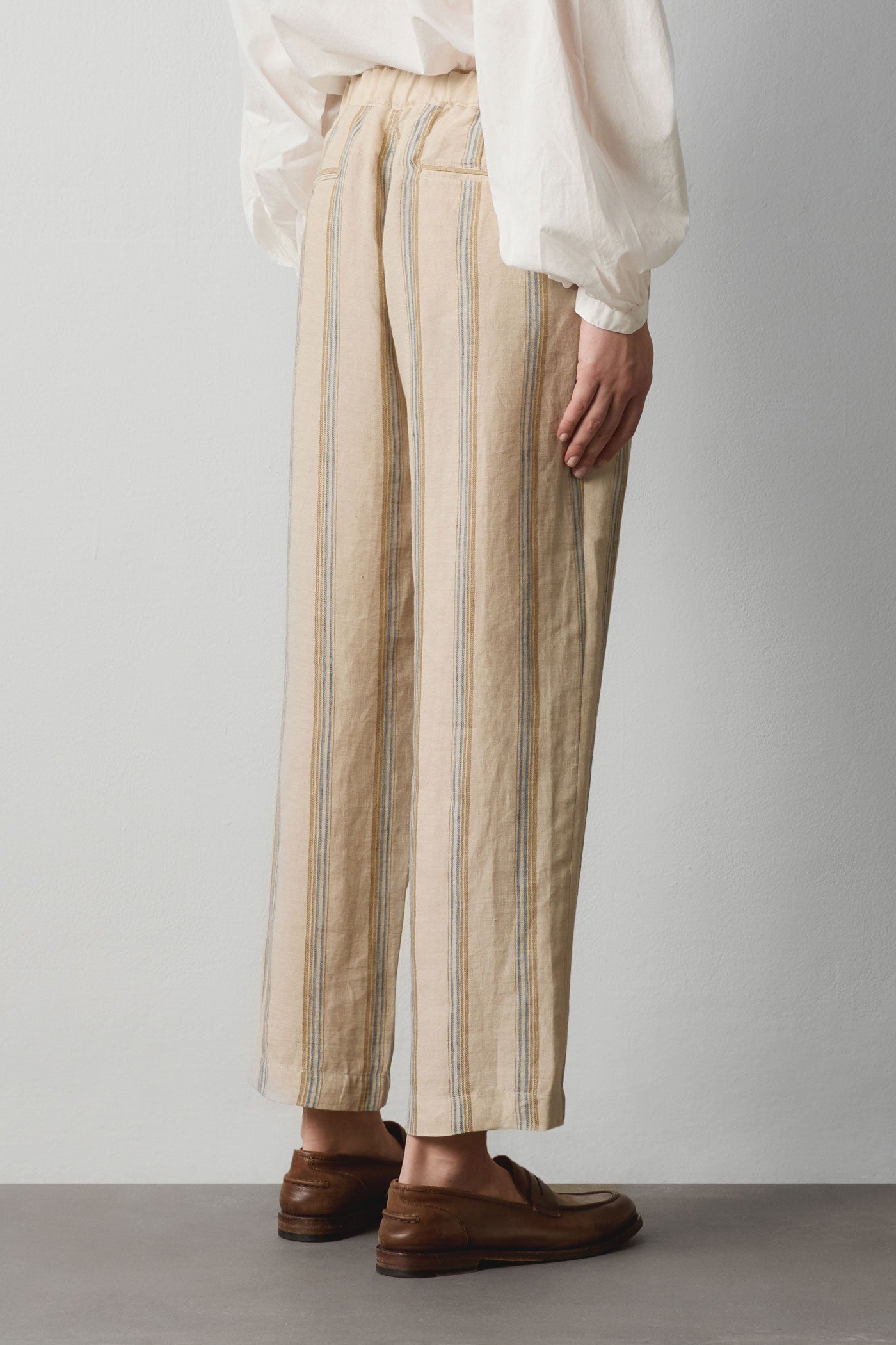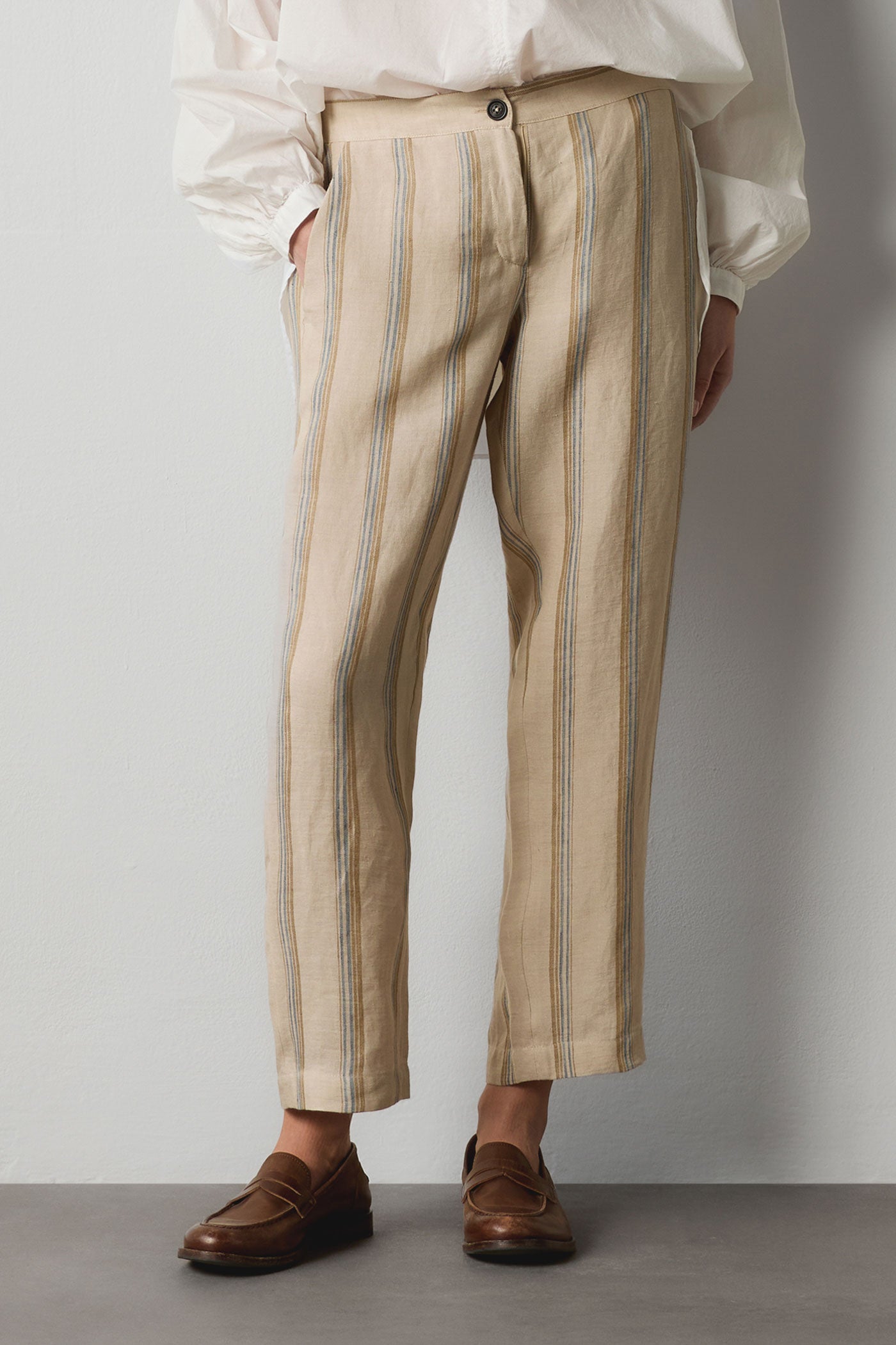 Classic-fit trousers, elastic waistband, front French pockets, back welt pockets, dark horn button and front zipper, ankle-length, made from striped jacquard linen. Made in Italy.